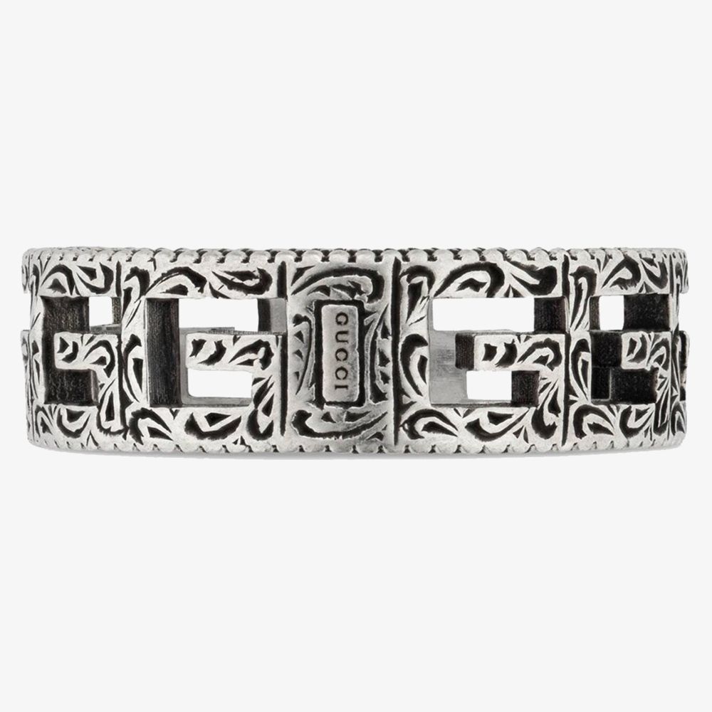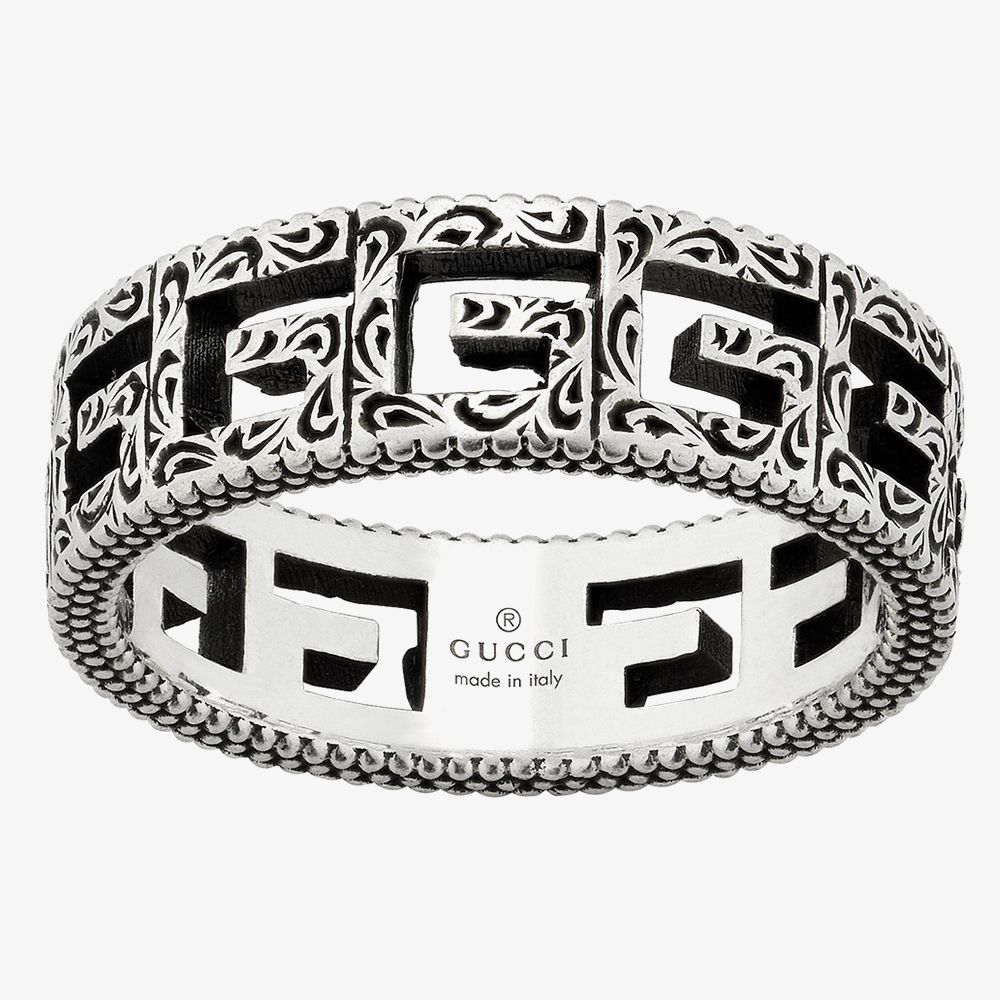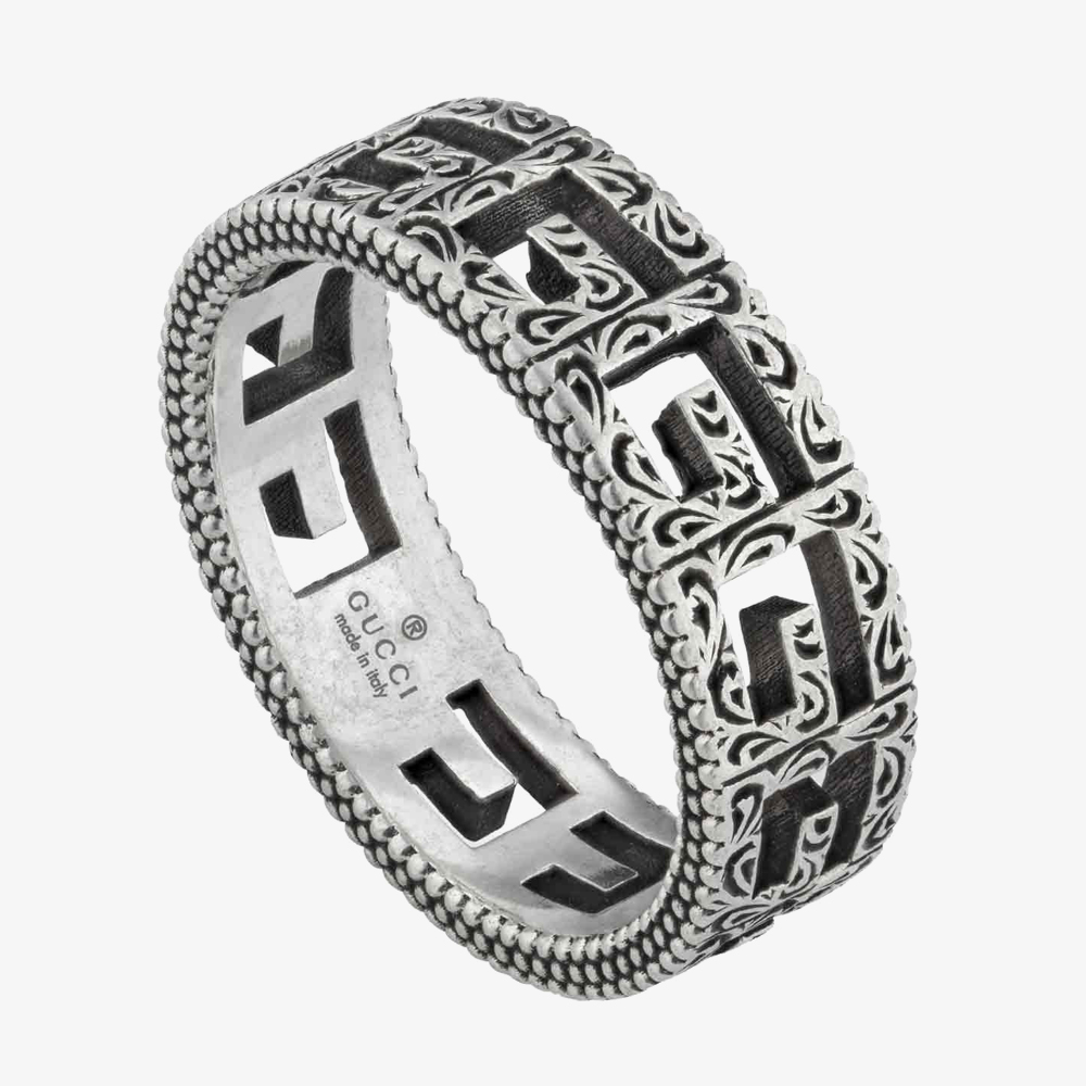 Providing a strong and elegant piece suitable for any man of style, the 'G' Cube Silver Motif Ring is the perfect way to style up any occasion. Made from high-quality 925 sterling silver, the ring features cut-out square 'G' motifs, an Arabesque-style pattern with a textured edge, and embossed Gucci logo details - making it a must have for all.