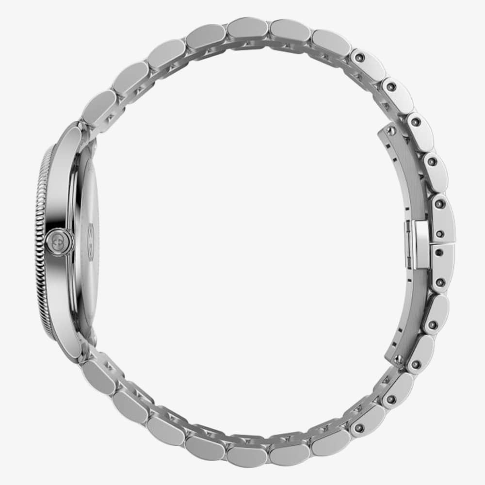 This watch is adorned with a delicate light pink dial featuring the iconic Interlocking G and Gucci lettering for a touch of luxury. Sleek baton hour markers grace the dial, accented by two sparkling diamonds. Crafted with sapphire glass and an anti-reflective coating, this timepiece blends classic sophistication with modern femininity.
