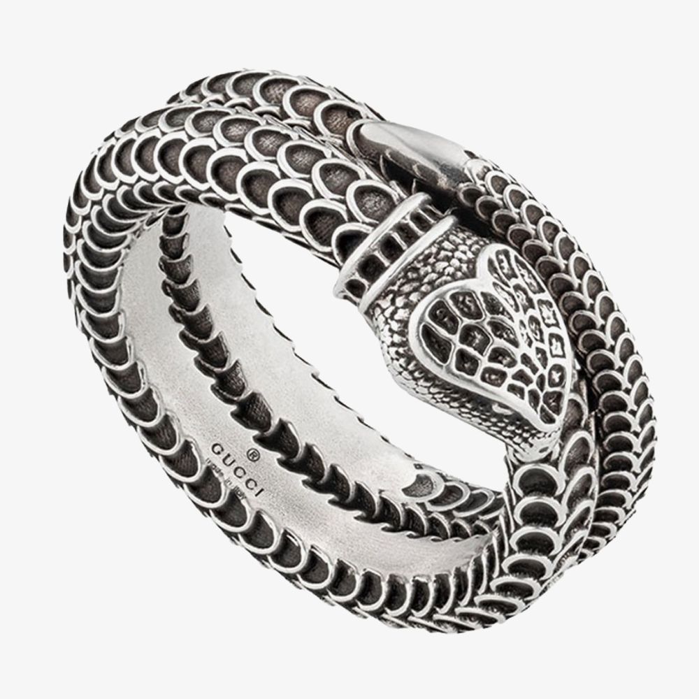 The Gucci Garden continues to grow with new interpretations of the nature-inspired line. The distinctive symbol of the house - two Kingsnakes intertwine to form this eye catching ring. the ring is finished with motifs that recreate the reptiles scales.