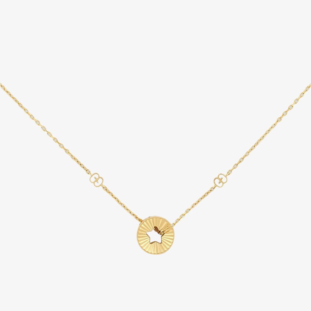 The precious Gucci Icon Star Necklace YBB72936300100U is presented with an 18ct yellow gold delicate chain featuring the iconic GG and star motifs. The necklaces focal point is a circular 3D charm which features a cut-out star that recalls the Gucci Cosmognie fashion show. This fashion show took place beneath the night sky at the Italian Castel del Monte taking inspiration from star constellations. This necklace is an ideal stand-alone piece or perfect for stacking with other Gucci necklaces to create your own unique look.
