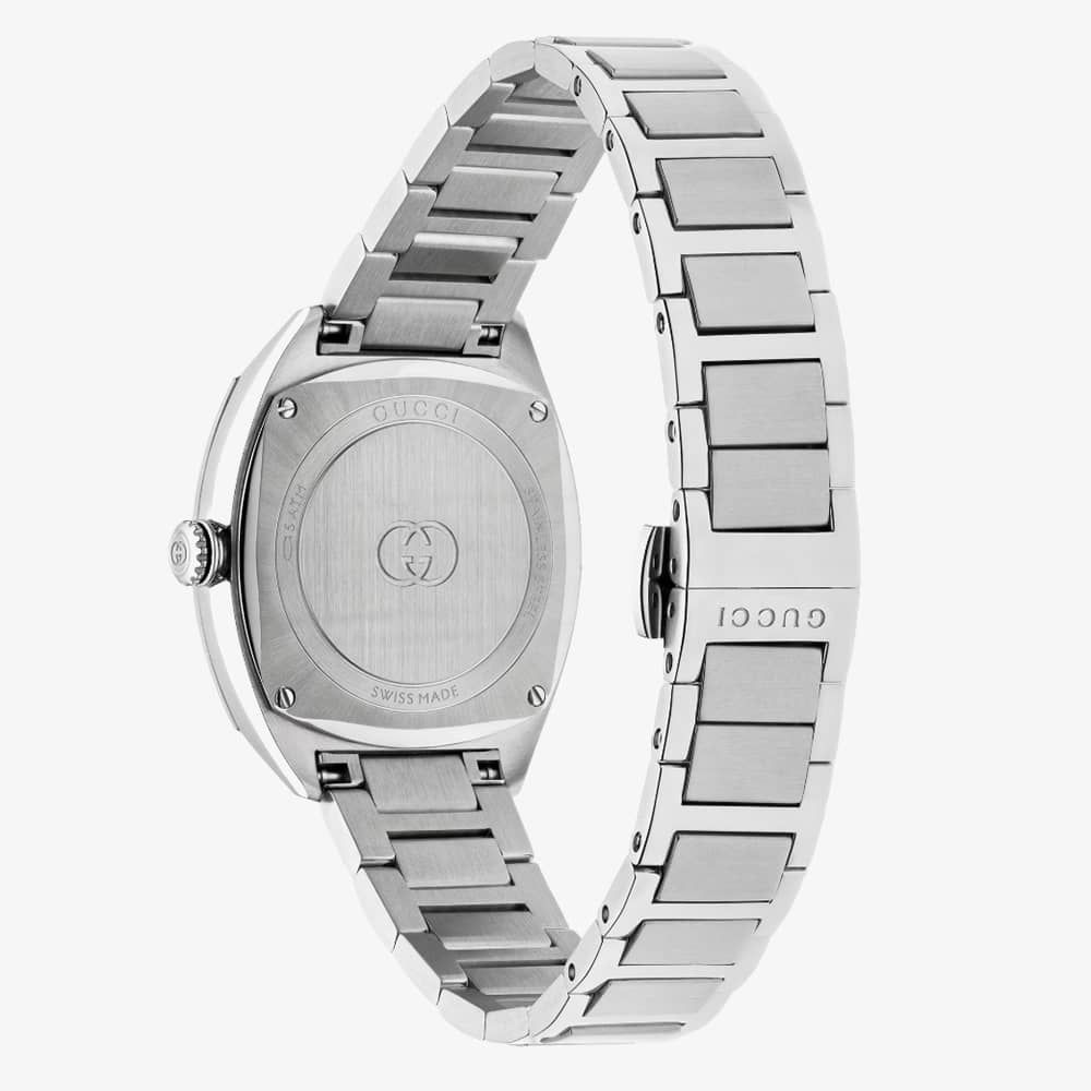 This Gucci Interlocking watch seamlessly blends the House's historic codes with a modern aesthetic. The case showcases a silver sun-brushed dial adorned with diamonds and pink gold-plated accents. Complemented by a stainless steel bracelet, this timepiece is enriched with the iconic Interlocking G logo featured in the small seconds display.