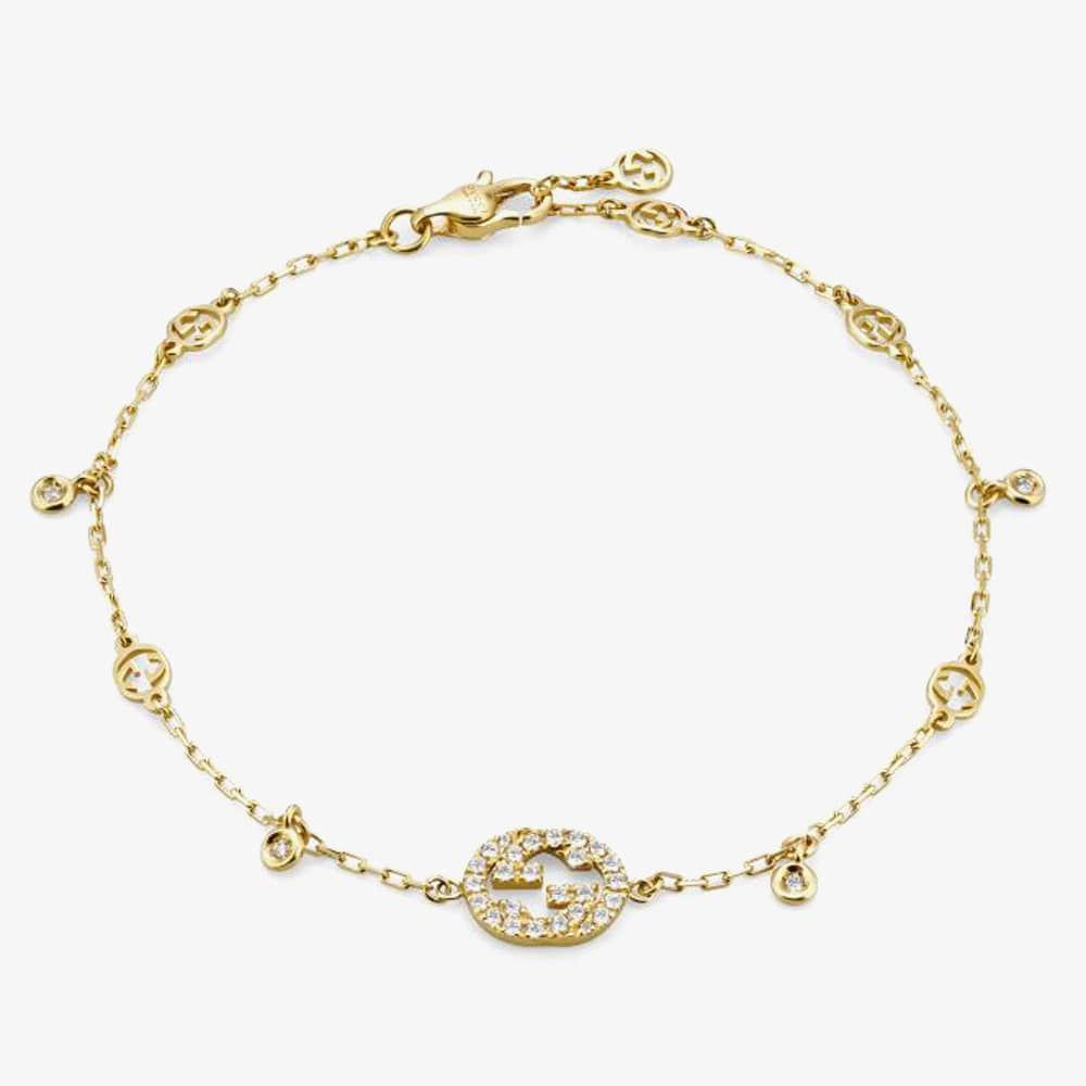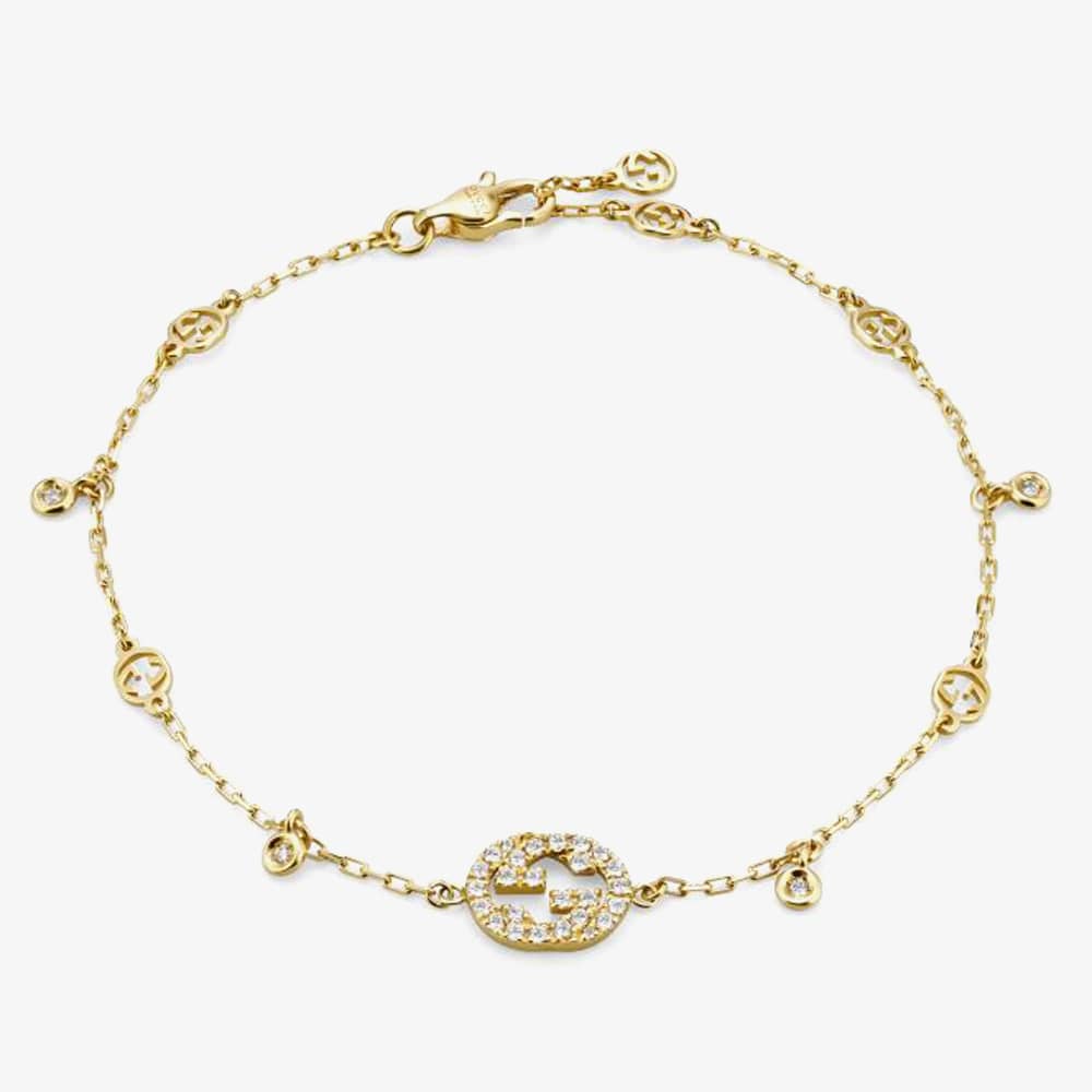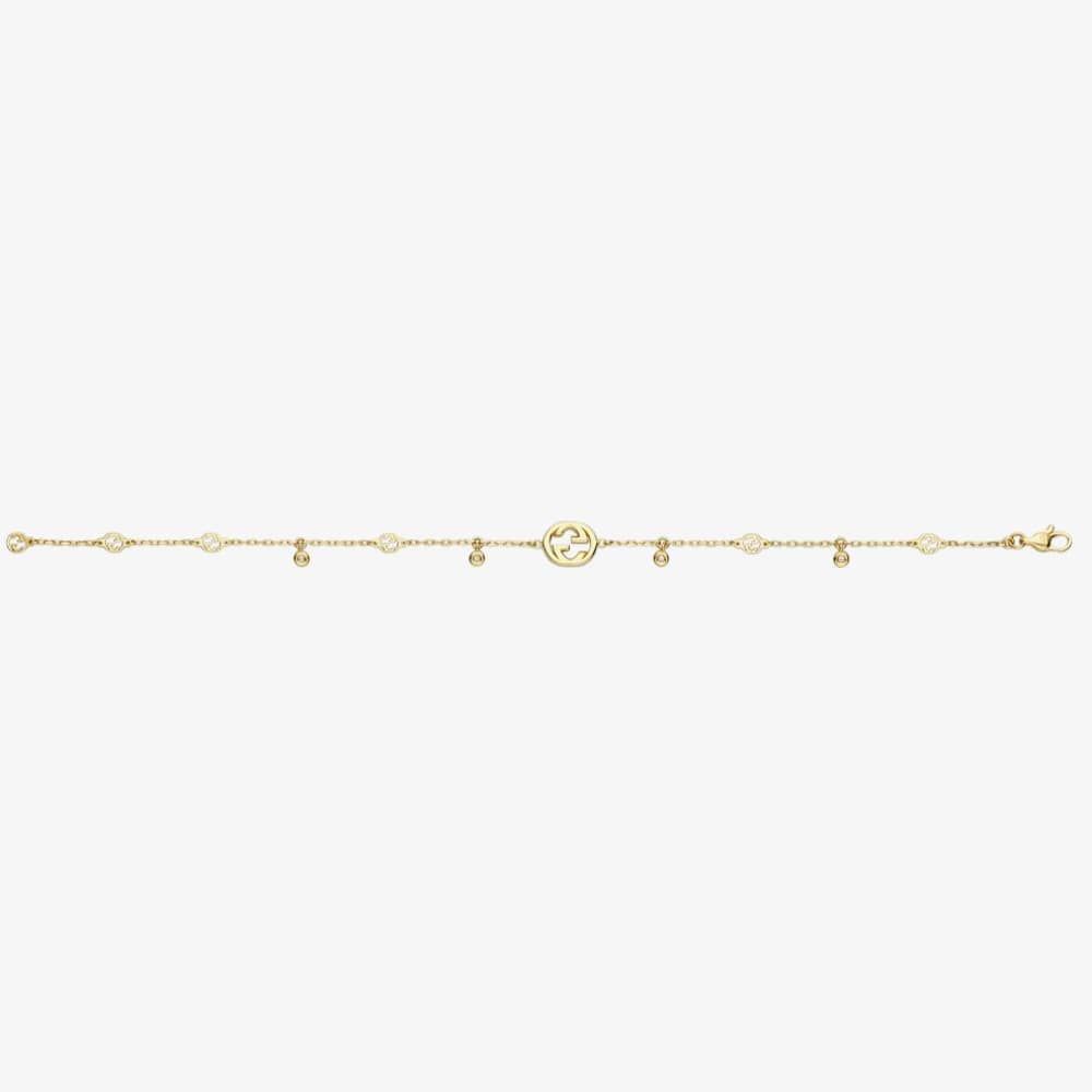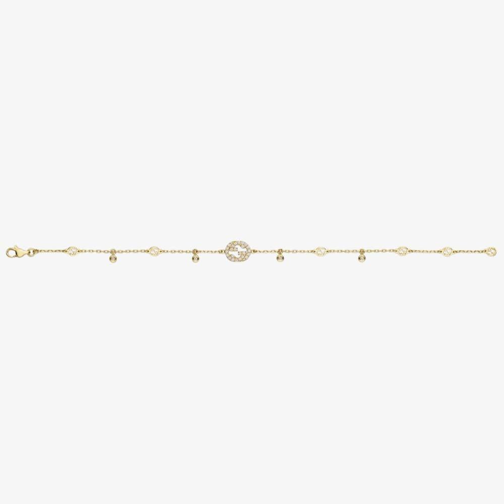 The Gucci Interlocking bracelet is a luxurious statement piece that is crafted from the finest 18ct yellow gold. The bracelet features the iconic Interlocking emblem at the centre, which is adorned with sparkling white diamonds. The chain is set with four small white diamonds that are positioned in an alternating pattern with small Interlocking motifs. The bracelet measures 17cm in length and is set on a belcher chain. The bracelet features a total of 0.22ct of brilliant-cut white diamonds, which have VVS1 clarity and G colour. This bracelet is a truly timeless piece that will add a touch of luxury and sophistication to any outfit.