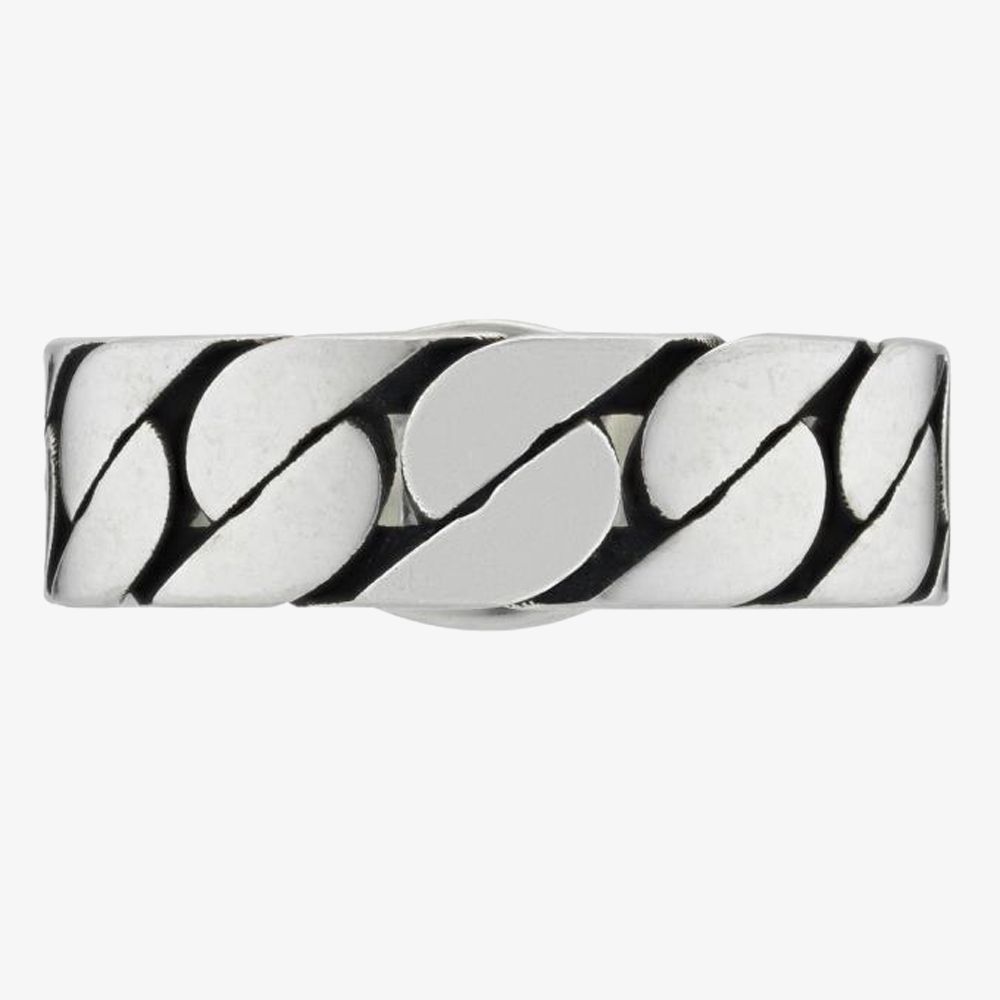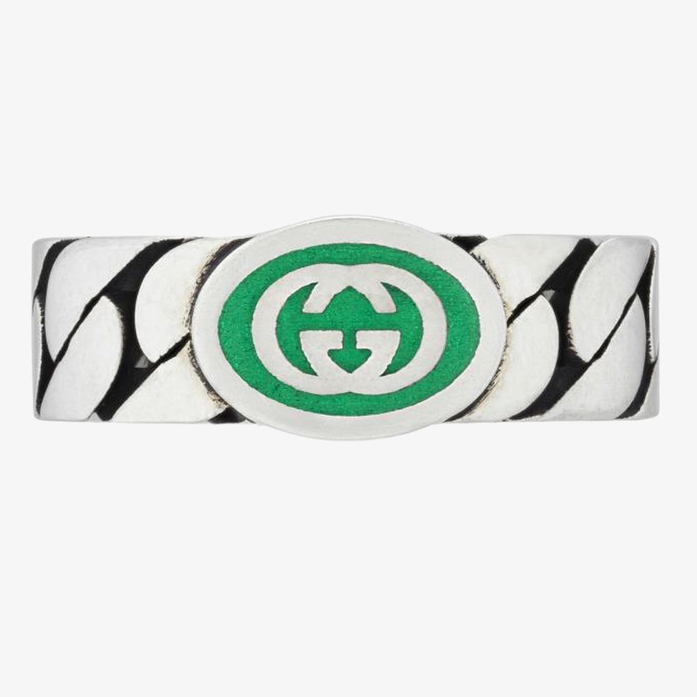 Gucci Interlocking 6mm Green Enamel Ring YBC7016120010 is delicately made from sterling silver with the dynamic chain-like effect designed to envelop the finger, measuring 6mm in width. The ring features the iconic double Interlocking motif with green enamel detailing.