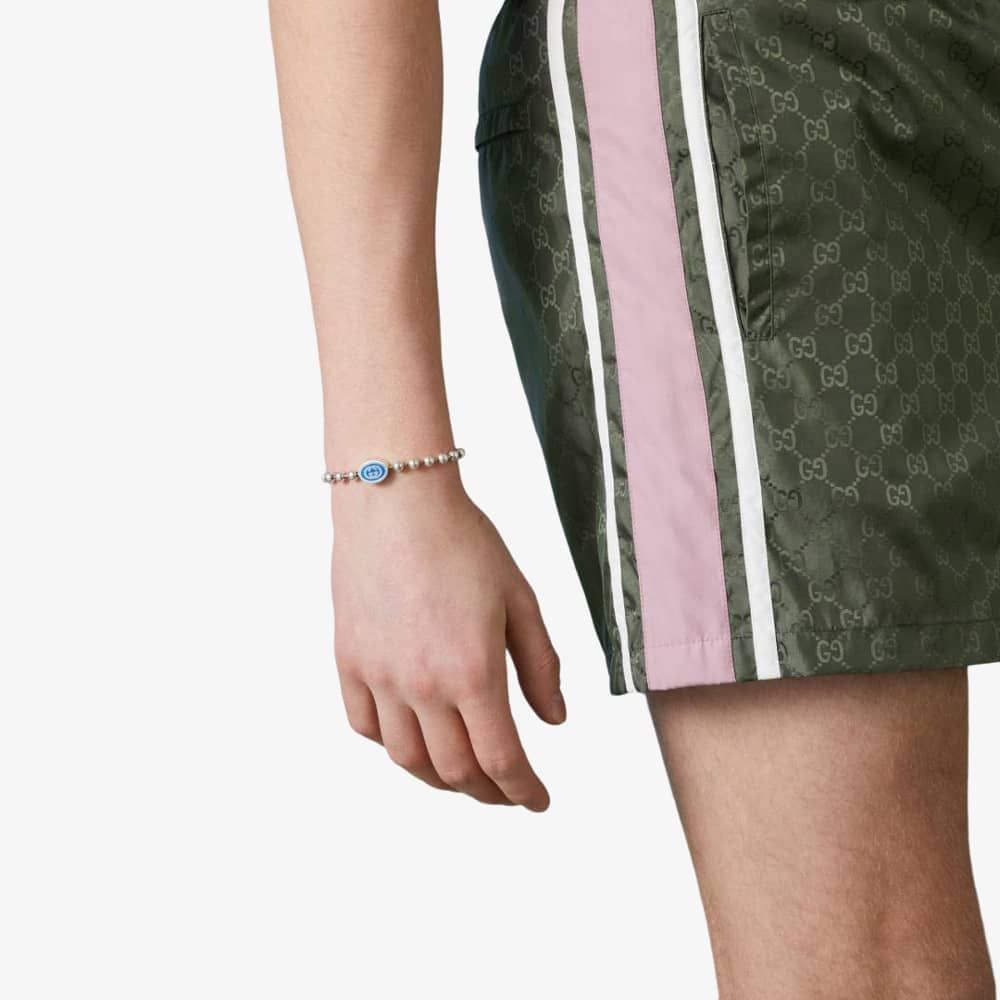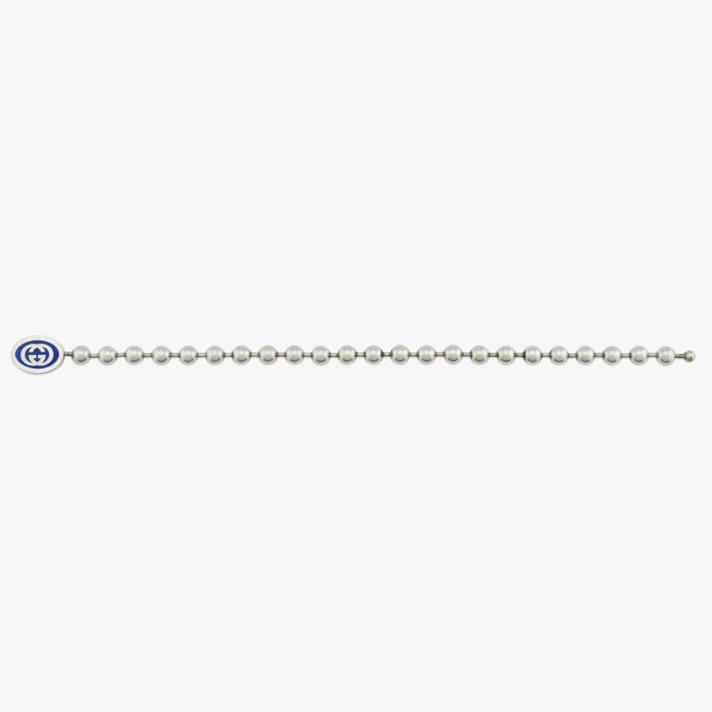 The Gucci Interlocking boule bracelet is delicately made from sterling silver with an aged, tumbled effect, defined by the iconic Interlocking motif, filled with blue enamel.
