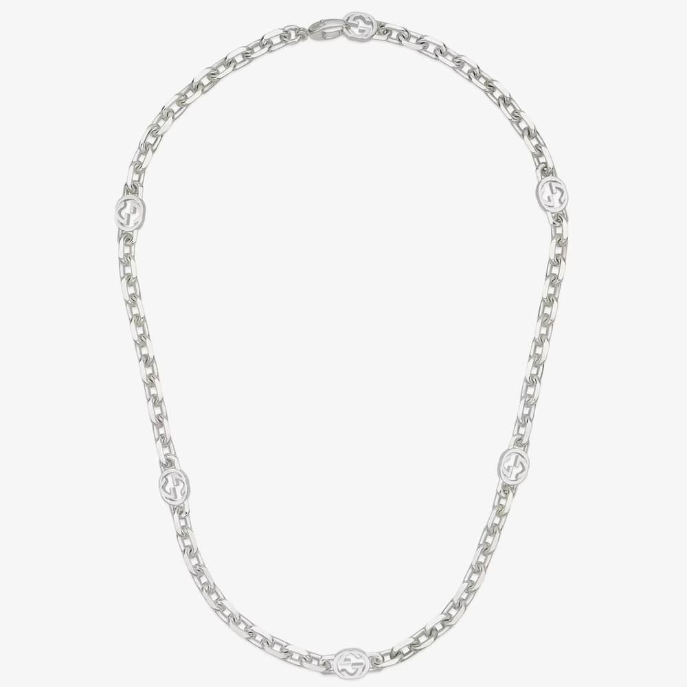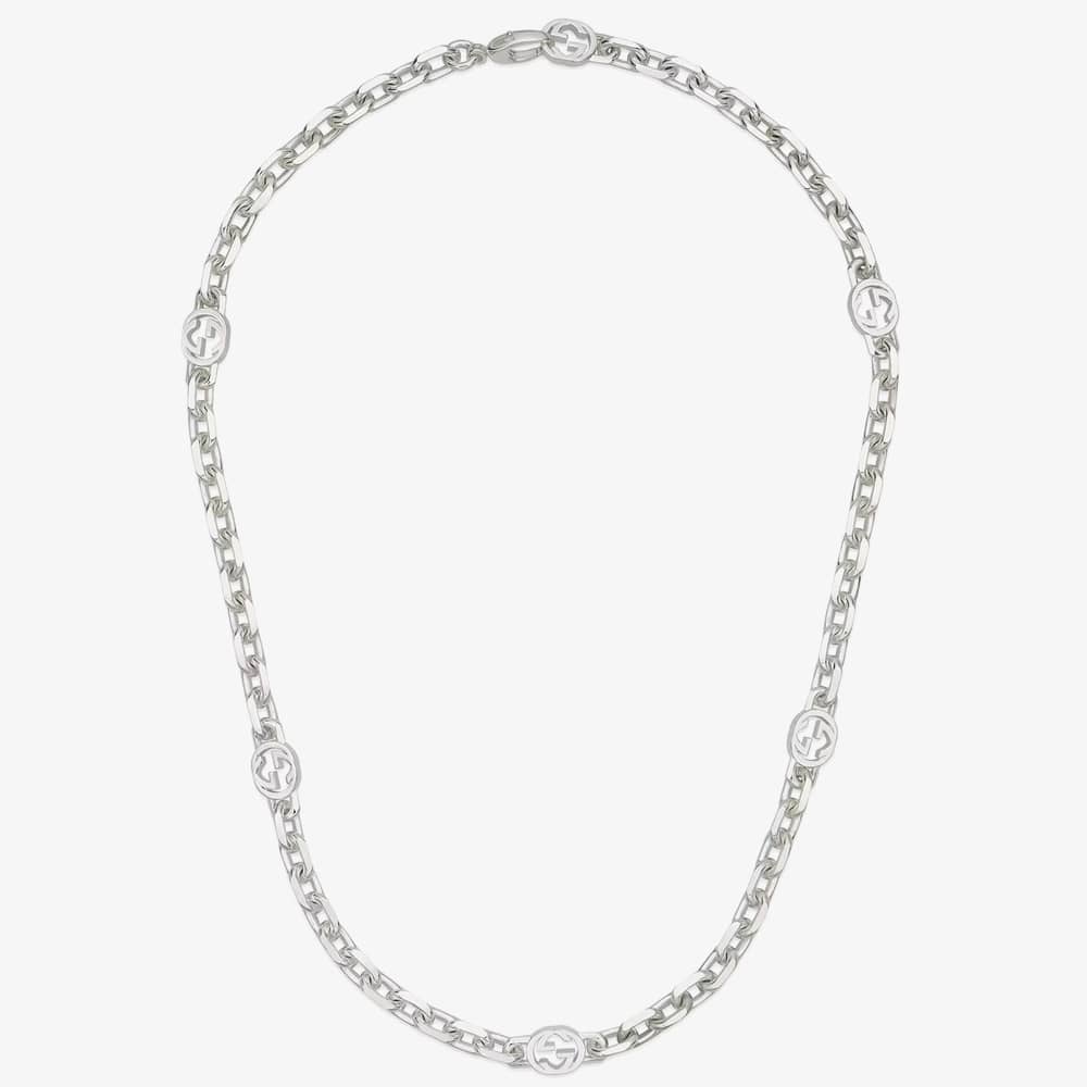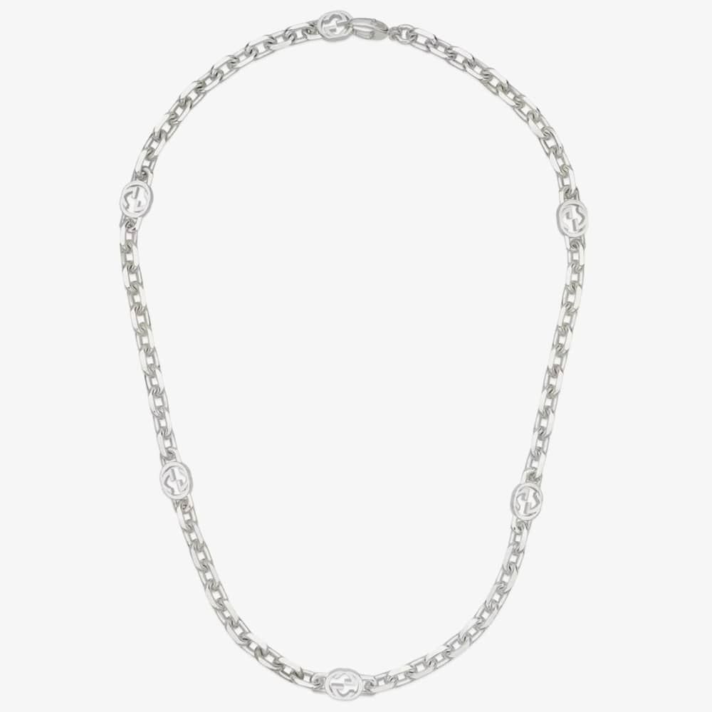 The Gucci Interlocking necklace is delicately made from sterling silver and defined by multiple iconic Interlocking motifs. The anchor chain necklace measures 50cm in length.