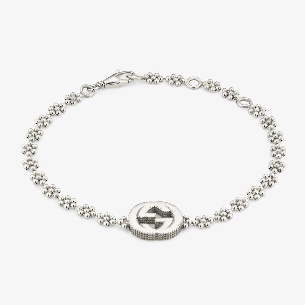 Give your attire an elegant floral edge with this stunning sterling silver bracelet from Gucci and the Interlocking range. The intricately detailed design features clusters of floral style beads coming together to hold the iconic Interlocking motif. The chunky centrepiece features an impressive mill grain edge, highlighting the prestigious style, especially when paired with the matching ring and necklace. Complete with secure lobster clasp and adjustable length fastenings for a comfortable fit.
