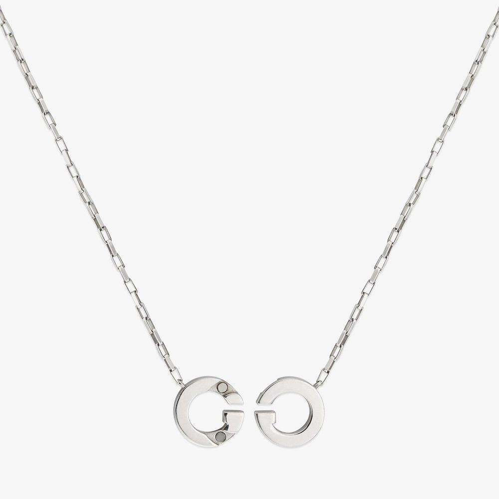 The Gucci Interlocking G Necklace features a bold cut-out G motif seamlessly integrated into a wide sterling silver box link chain, with the magnetic closure cleverly built into the G itself. Measuring 45cm, this iconic piece combines contemporary design with luxury branding for a striking, versatile accessory.