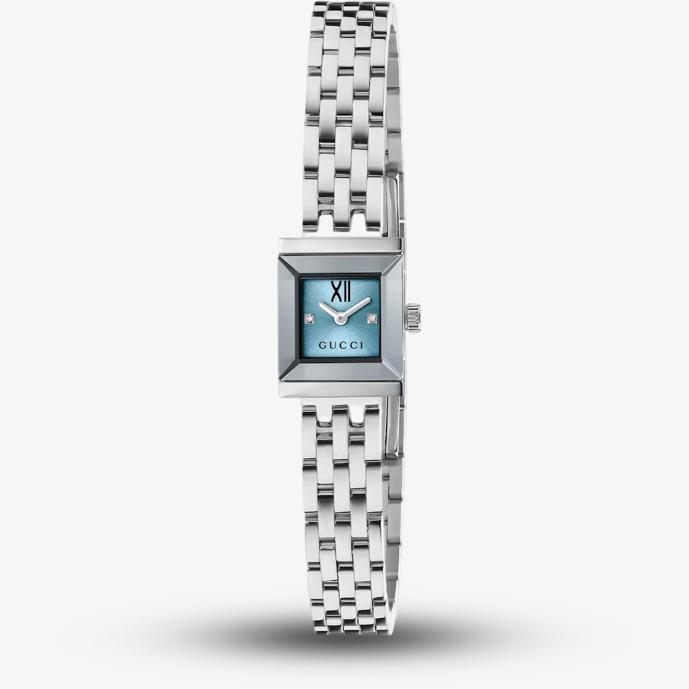 • 30 metre water resistance.Guccihttps://www.thbaker.co.uk/media/catalog/product/2/4/24-14-25157017_gucci_03.jpghttps://www.thbaker.co.uk/media/catalog/product/2/4/24-14-25157017_gucci_02.jpghttps://www.thbaker.co.uk/media/catalog/product/2/4/24-14-25157017_gucci_04.jpgcondition:Nodisc_no_stock:Noex_display:NoNoNoNo241425157017GucciYA128540LadiesOfficial Gucci Packaging2 Year Gucci WarrantyLuxuryNoWatchSilverStainless Steel BraceletStainless SteelSquare14.0mmAnalogueSapphire Crystal GlassBlueBlue30 metresQuartzSpecial ClaspSilverDiamondNoNoNoNoNoNoNo{"name":"v12_finance","text":"Or from \u00a322 per month","imageUrl":"https:\/\/www.thbaker.co.uk\/media\/nosto\/v12-finance.png"}Gucci Ladies G-Frame Blue Square Dial Watch24-14-251570172026-03-31 00:00:000[{"path":"\/Watches","url":"\/watches\/"},{"path":"\/Brands A-Z\/Gucci","url":"\/gucci-jewellery\/"},{"path":"\/Watches\/Ladies Watches","url":"\/ladies-watches\/"},{"path":"\/Watches\/Designer Watches","url":"\/designer-watches\/"},{"path":"\/Watches\/Diamond Set Watches","url":"\/diamond-watches\/"},{"path":"\/Brands A-Z\/Gucci\/Gucci Watches","url":"\/gucci-watches\/"},{"path":"\/Brands A-Z\/Gucci\/Gucci Watches\/Gucci Ladies Watches","url":"\/gucci-ladies-watches\/"},{"path":"\/Brands A-Z\/Gucci\/Gucci Watches\/Gucci G-Frame Watches","url":"\/gucci-g-frame-watches\/"},{"path":"\/Watches\/Bracelet Watches","url":"\/bracelet-watches\/"},{"path":"\/Watches\/Quartz Watches","url":"\/quartz-watches\/"},{"path":"\/Watches\/Swiss Watches","url":"\/swiss-watches\/"},{"path":"\/Brands A-Z\/Gucci\/Gucci Ladies","url":"\/gucci-ladies\/"},{"path":"\/Watches\/Luxury Watches","url":"\/luxury-watches\/"},{"path":"\/Jewellery Gifts\/Luxury Gifts","url":"\/luxury-gifts\/"},{"path":"\/Free Gift Card - When you spend \u00a3500+","url":"\/free-gift-card\/"},{"path":"\/Watches\/Luxury Watches\/Ladies Luxury Watches","url":"\/ladies-luxury-watches\/"},{"path":"\/Spend over \u00a31000 and receive a \u00a3100 gift card","url":"\/gift-card-promotion\/"},{"path":"\/\u00a3150 Gold Gift Card (\u00a31000 - \u00a32000)","url":"\/150-gold-gift-card\/"},{"path":"\/Jewellery Gifts","url":"\/jewellery-gifts\/"},{"path":"\/Free Gift With Purchase Products","url":"\/free-gift-with-purchase-products\/"}]2026-03-31