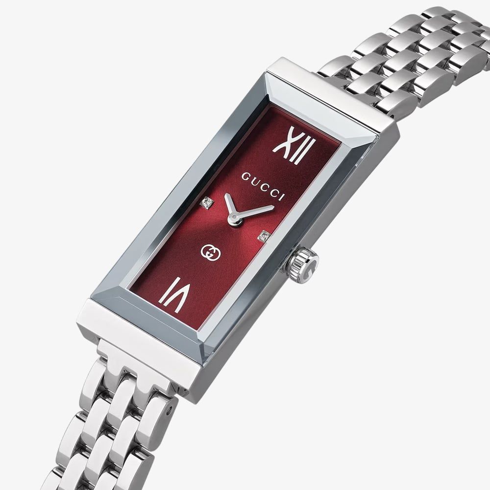 • 30 metre water resistance.Guccihttps://www.thbaker.co.uk/media/catalog/product/2/4/24-14-25157010_gucci_03.jpghttps://www.thbaker.co.uk/media/catalog/product/2/4/24-14-25157010_gucci_04.jpghttps://www.thbaker.co.uk/media/catalog/product/2/4/24-14-25157010_gucci_02.jpgcondition:Nodisc_no_stock:Noex_display:NoNoNoNo241425157010GucciYA127518LadiesOfficial Gucci Packaging2 Year Gucci WarrantyLuxuryNoWatchSilverStainless Steel BraceletStainless SteelRectangle34.0mmAnalogueSapphire Crystal GlassRedRed30 metresQuartzSpecial ClaspSilverDiamondNoNoNoNoNoNoNo{"name":"v12_finance","text":"Or from \u00a324 per month","imageUrl":"https:\/\/www.thbaker.co.uk\/media\/nosto\/v12-finance.png"}Gucci Ladies G-Frame Red Rectangular Dial Watch24-14-251570102026-03-31 00:00:000[{"path":"\/Watches","url":"\/watches\/"},{"path":"\/Brands A-Z\/Gucci","url":"\/gucci-jewellery\/"},{"path":"\/Watches\/Ladies Watches","url":"\/ladies-watches\/"},{"path":"\/Watches\/Designer Watches","url":"\/designer-watches\/"},{"path":"\/Watches\/Diamond Set Watches","url":"\/diamond-watches\/"},{"path":"\/Brands A-Z\/Gucci\/Gucci Watches","url":"\/gucci-watches\/"},{"path":"\/Brands A-Z\/Gucci\/Gucci Watches\/Gucci Ladies Watches","url":"\/gucci-ladies-watches\/"},{"path":"\/Brands A-Z\/Gucci\/Gucci Watches\/Gucci G-Frame Watches","url":"\/gucci-g-frame-watches\/"},{"path":"\/Watches\/Bracelet Watches","url":"\/bracelet-watches\/"},{"path":"\/Watches\/Quartz Watches","url":"\/quartz-watches\/"},{"path":"\/Watches\/Swiss Watches","url":"\/swiss-watches\/"},{"path":"\/Brands A-Z\/Gucci\/Gucci Ladies","url":"\/gucci-ladies\/"},{"path":"\/Watches\/Luxury Watches","url":"\/luxury-watches\/"},{"path":"\/Jewellery Gifts\/Luxury Gifts","url":"\/luxury-gifts\/"},{"path":"\/Free Gift Card - When you spend \u00a3500+","url":"\/free-gift-card\/"},{"path":"\/Watches\/Luxury Watches\/Ladies Luxury Watches","url":"\/ladies-luxury-watches\/"},{"path":"\/Watches\/Colourful Watches","url":"\/colourful-watches\/"},{"path":"\/Spend over \u00a31000 and receive a \u00a3100 gift card","url":"\/gift-card-promotion\/"},{"path":"\/\u00a3150 Gold Gift Card (\u00a31000 - \u00a32000)","url":"\/150-gold-gift-card\/"},{"path":"\/Jewellery Gifts","url":"\/jewellery-gifts\/"},{"path":"\/Free Gift With Purchase Products","url":"\/free-gift-with-purchase-products\/"},{"path":"\/Watches\/Colourful Watches\/Pink & Red Watches","url":"\/pink-and-red-watches\/"}]2026-03-31