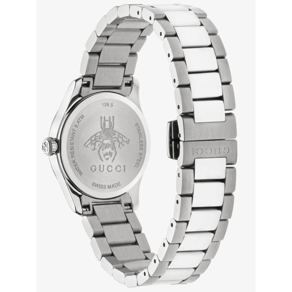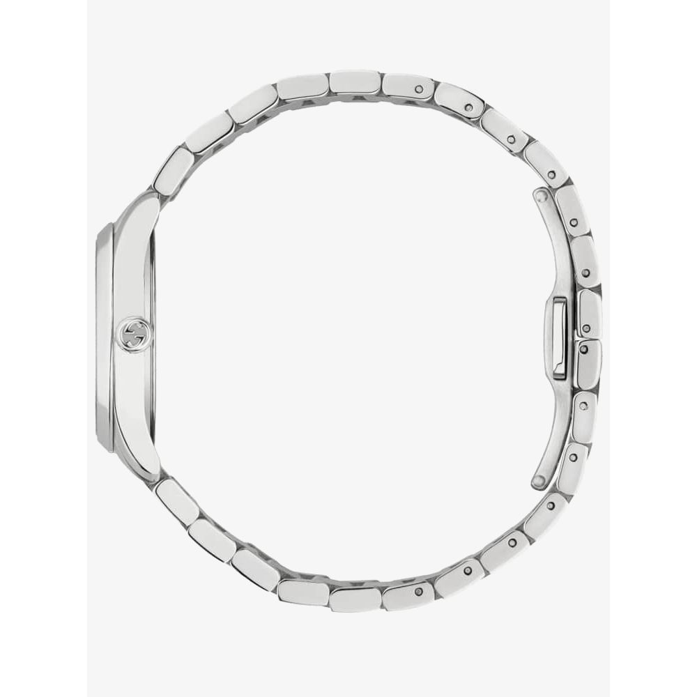 Crafted in stainless steel, this G-Timeless watch features a pink mother of pearl dial adorned with a cat motif in the centre & bee, stars, hearts, dots and Interlocking motifs for hour markers. The watch is finished with a polished and brushed bracelet with a push deployment clasp fastening.