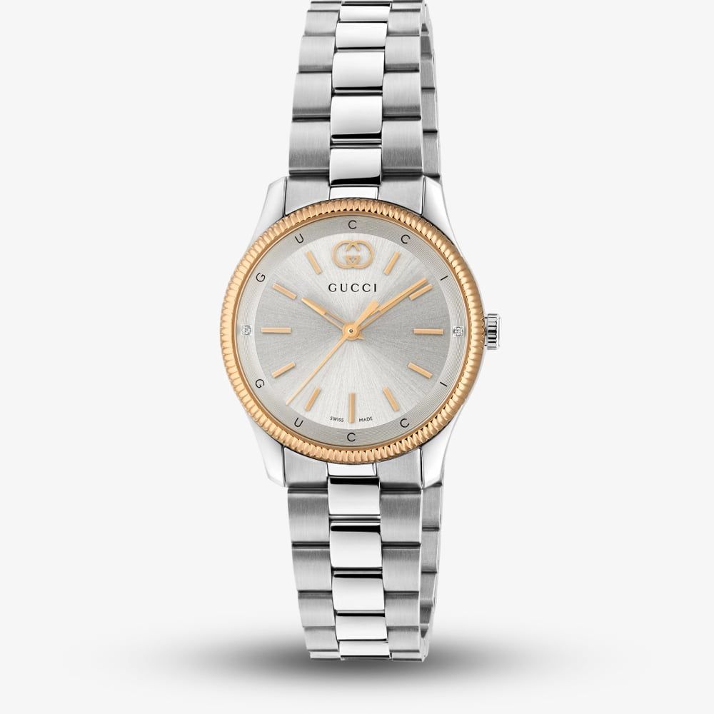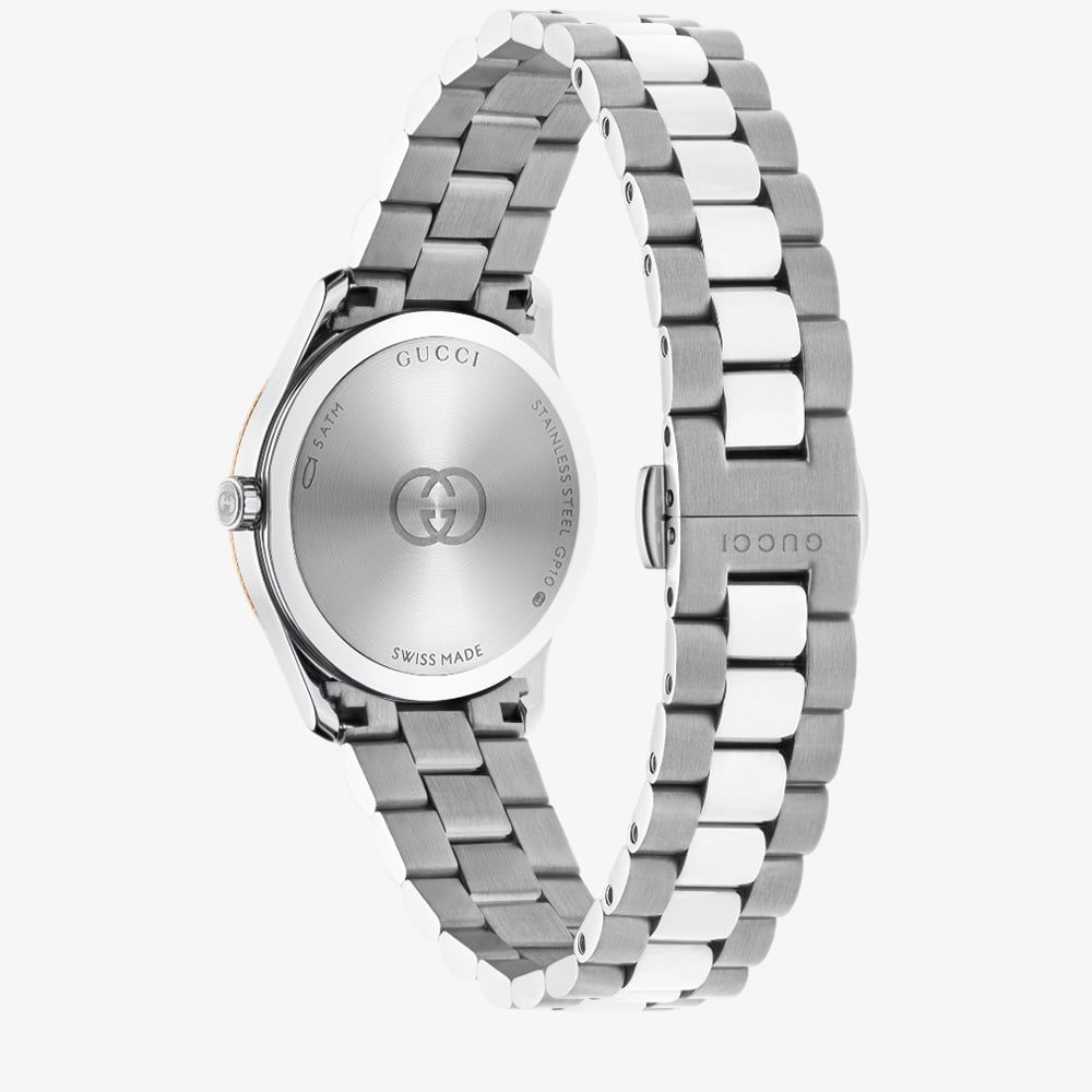 Crafted with meticulous attention to detail, this timepiece seamlessly blends luxury with functionality .The watch features a luxurious rose gold-plated bezel. Its dial is adorned with Gucci's signature interlocking G motif, adding a touch of charm. The scratch-resistant sapphire crystal ensures durability while enhancing clarity, ensuring that the watch remains in pristine condition. Powered by a precise Swiss quartz movement, this watch not only keeps impeccable time but also serves as a statement of style and luxury. Whether worn for everyday or special occasions, this watch is designed to elevate any ensemble.