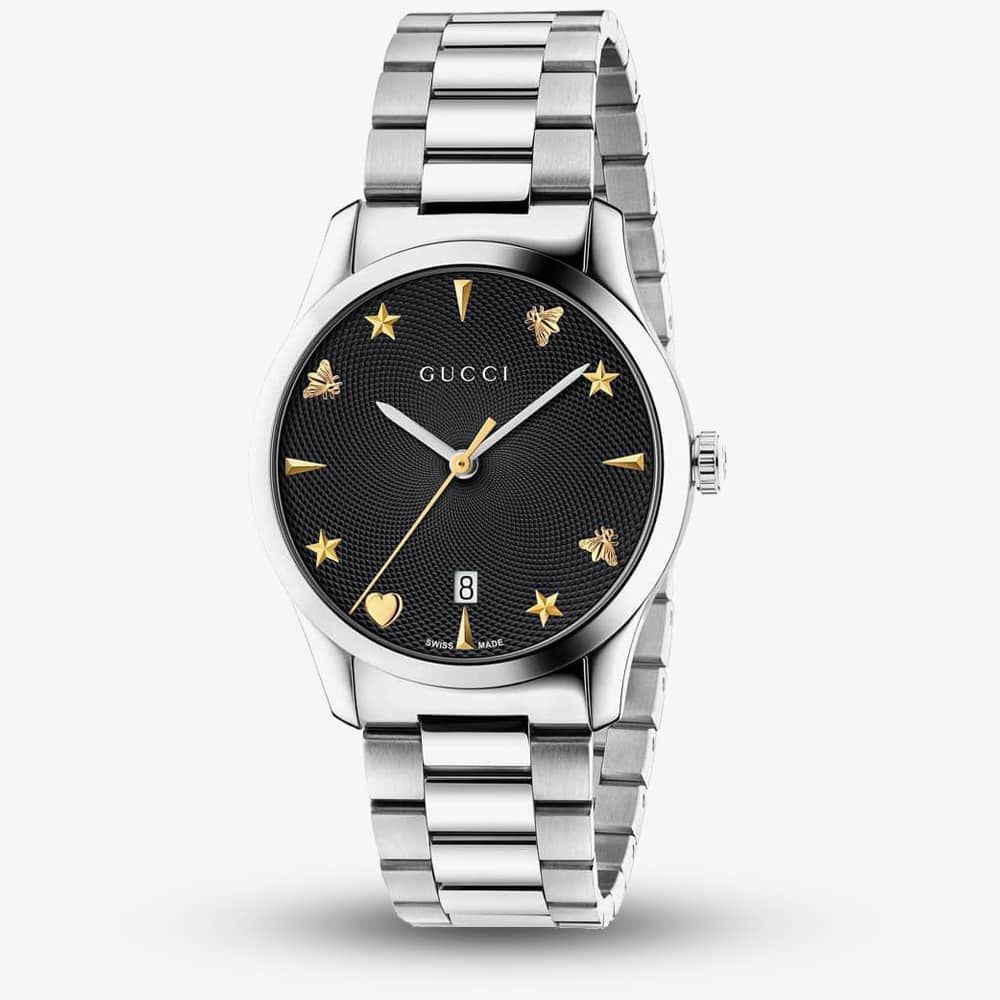 https://www.thbaker.co.uk/gucci-ladies-g-timeless-stainless-steel-house-motif-black-dial-bracelet-watch-ya1264029a81708Gucci Ladies G-Timeless Stainless Steel House Motif Black Dial Bracelet Watch YA1264029Ahttps://www.thbaker.co.uk/media/catalog/product/2/4/24-14-267_grey.jpg7951090GBPOutOfStockG-TIMELESS MD SS BW BLK Complement your outfits with an exquisite item from Gucci. Flawless stainless steel has been used to form this piece which features an amazing link bracelet and push button deployment fastening clasp. An eye catching selection of gold tone bees, stars, pointed batons and love heart provide stylish markers signifying each hour, with the current time displayed by a matching gold trio of quartz powered dial hands. As well as their trademark logo branding, Gucci has added a date display window located above 6 o’clock. The contrasting black patterned background produces a clear and legible quality when glancing at the time, demonstrating a brilliantly executed and well thought out design. Sapphire crystal covers the dial and possesses scratch resistant properties, ensuring it remains protected at all times. Treat yourself or a loved one today. Guccihttps://www.thbaker.co.uk/media/catalog/product/2/4/24-14-267-gucci-ladies-g-timeless-stainless-steel-house-motif-black-dial-bracelet-watch-ya1264029a-2_grey_1.jpghttps://www.thbaker.co.uk/media/catalog/product/2/4/24-14-267-gucci-ladies-g-timeless-stainless-steel-house-motif-black-dial-bracelet-watch-ya1264029a-3_grey_1.jpg731903462281condition:Nodisc_no_stock:Yesex_display:NoNoYesNo2414267GucciYA1264029ALadiesOfficial Gucci Packaging2 Year Gucci WarrantyLuxuryNoG-TimelessWatchSilverStainless Steel BraceletStainless SteelRound38mmAnalogueSapphire Crystal GlassBlack50 metresQuartzPush Button Deployment ClaspNoNoNoNoYesNoNoGucci Ladies G-Timeless Stainless Steel House Motif Black Dial Bracelet Watch24-14-2672019-03-22 00:00:00[]2019-03-22