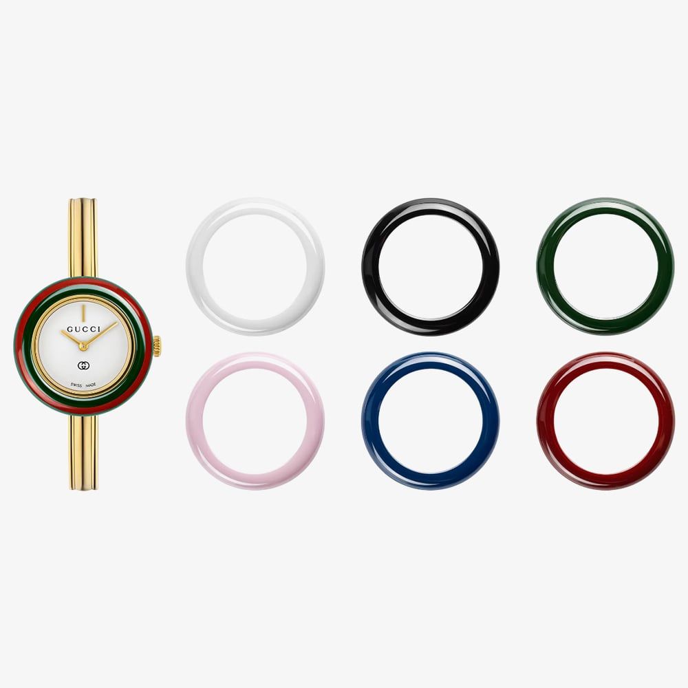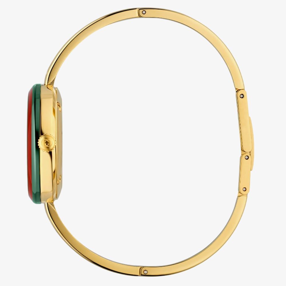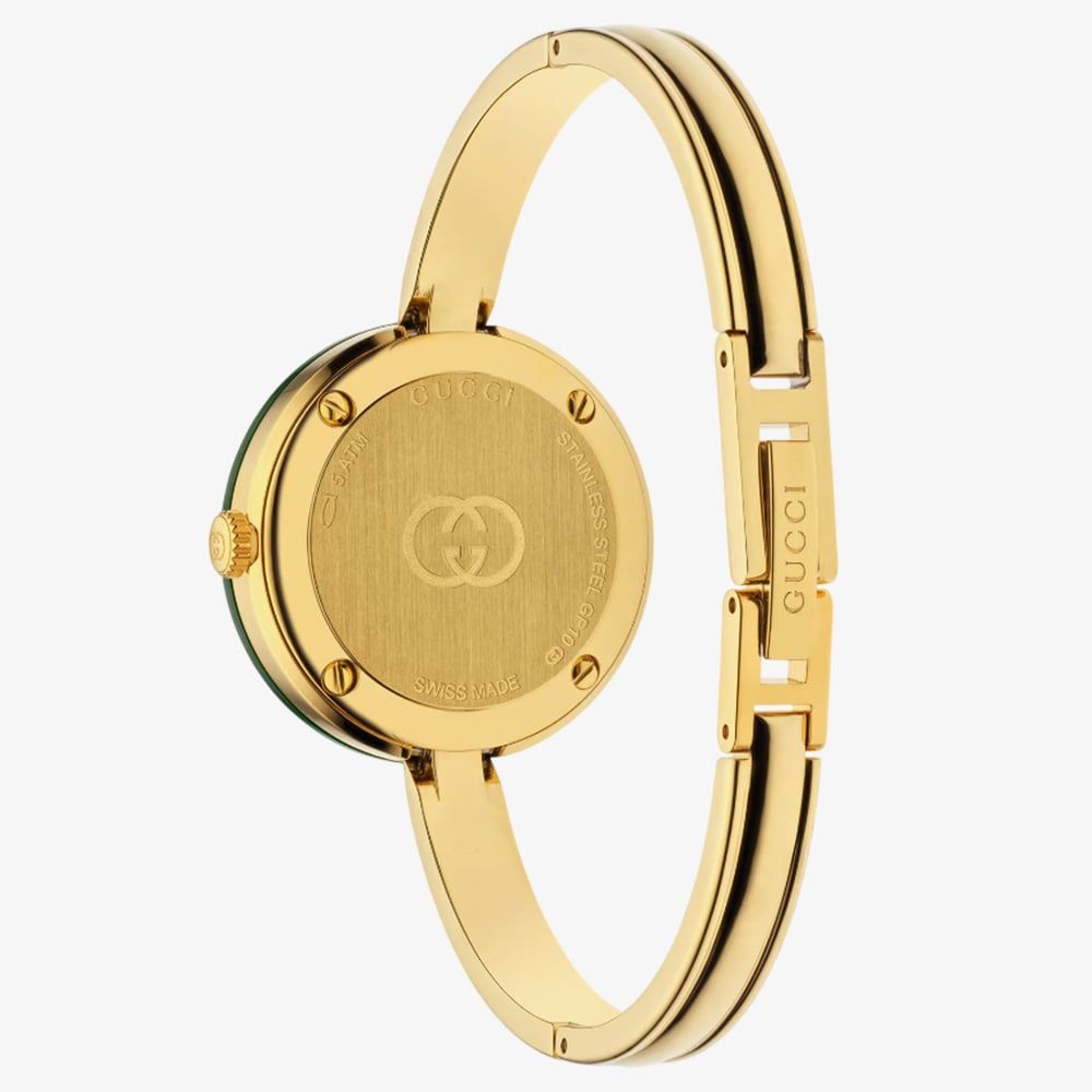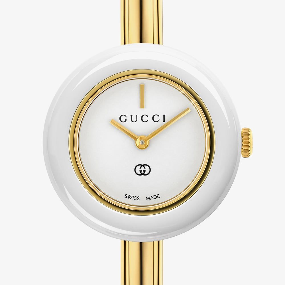 Crafted with Gucci’s playful modernity and refined Swiss precision, the Gucci Play YA151543 brings a graceful lightness to everyday style. Its 28mm yellow gold toned stainless steel case feels smooth and warm against the wrist, paired with a matching bangle that fits a 15cm wrist size to give the piece a jewellery like character. A set of seven interchangeable ceramic bezels invites personal expression, each one clicking neatly into place with a satisfying tactility that speaks to the brand’s considered craftsmanship.