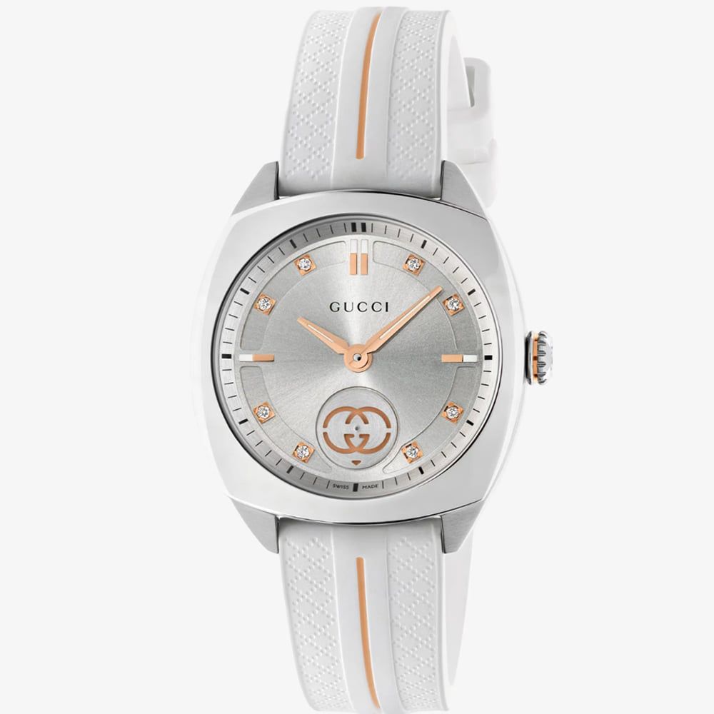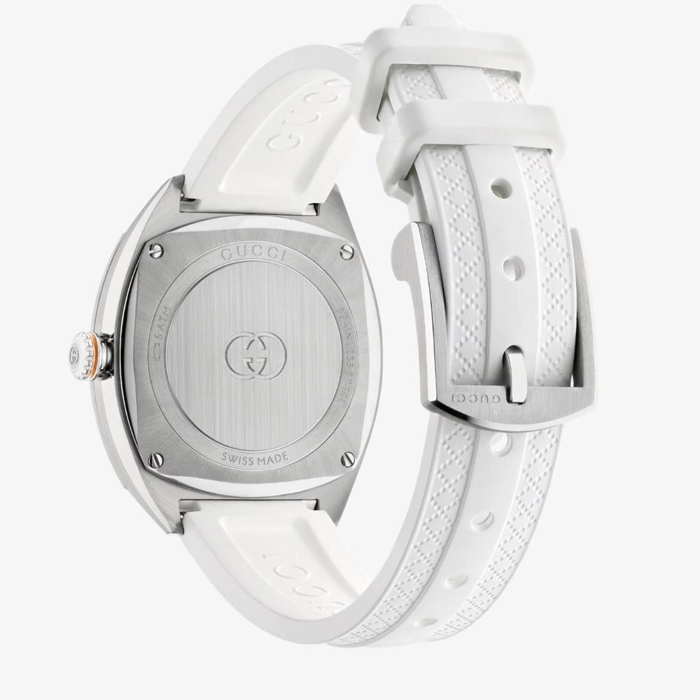 A bold expression of modern elegance and iconic design. This timepiece fuses luxury with a sporty edge. The standout feature is the signature interlocking double G logo on the dial, a timeless emblem of the Gucci brand, crafted in sleek stainless steel. The sleek silver dial radiates sophistication and simplicity, making it effortlessly versatile for day-to-night wear. The white rubber strap adds a fresh, modern twist while ensuring all-day comfort and durability. With water resistance up to 50 metres, it's as functional as it is fashionable.