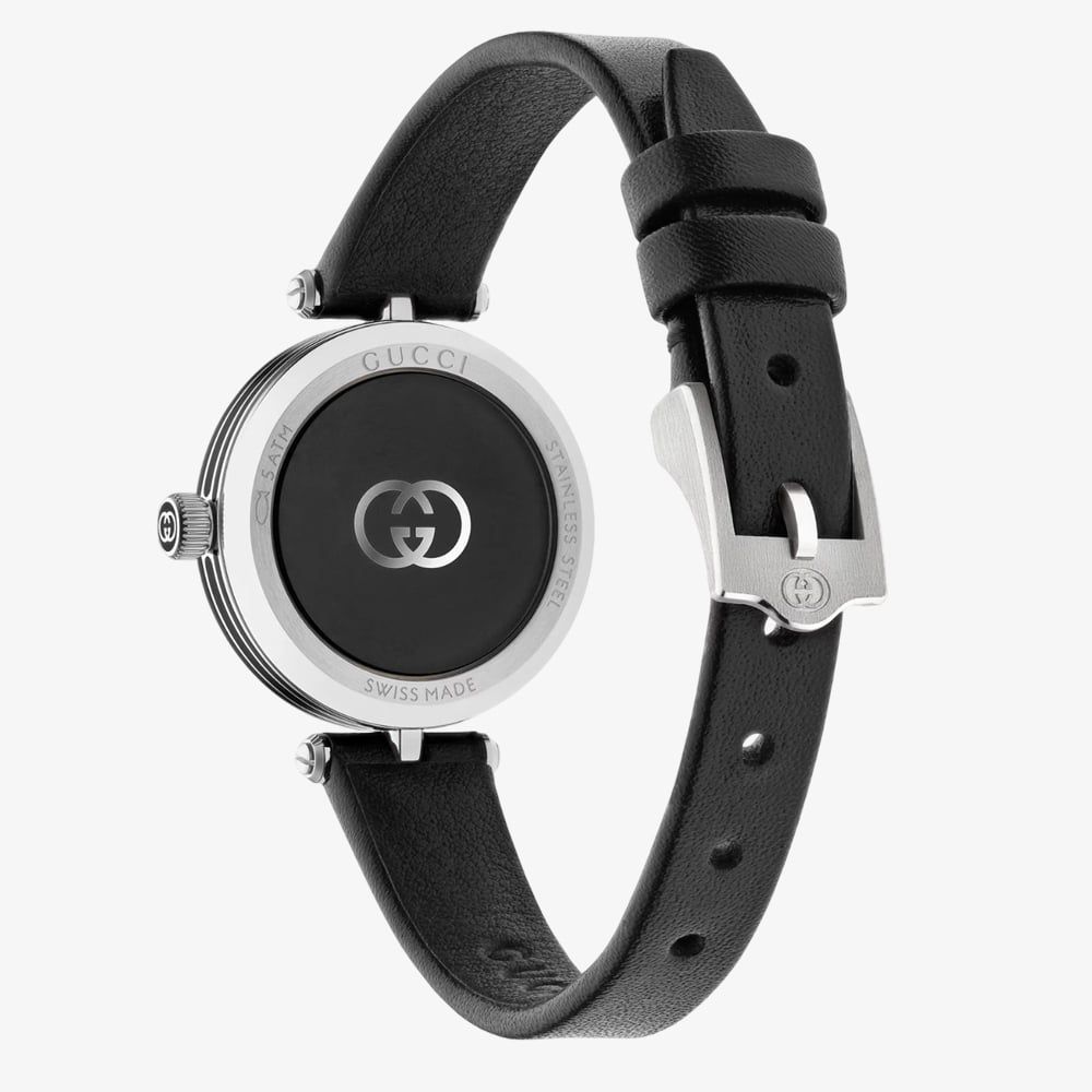 A sophisticated accessory that reflects the iconic style and innovation of the Gucci brand. Sleek and versatile, this watch embodies refined minimalism with a bold twist. The standout design features a polished stainless steel case paired with a smooth black dial, offering a clean and contemporary look. Subtle Gucci branding on the dial adds a touch of luxury, while the slim profile creates a graceful design that complements any wrist. The black rubber strap brings a sporty yet chic element, ensuring all-day comfort and a secure fit.