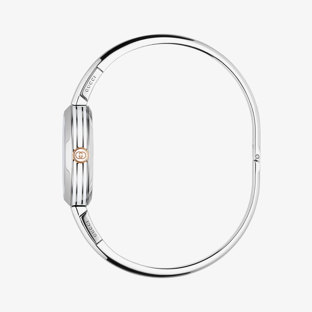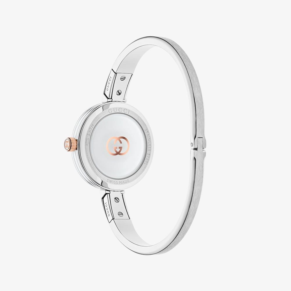 The Gucci Model 2000 Ladies Bangle Watch YA167513 marries Italian elegance with Swiss precision in a polished, minimalist 24mm stainless steel case. Its silver guilloché dial is complemented by white resin accents along the case sides, all protected by sapphire crystal with anti-reflective coating. The 15 cm stainless steel bangle offers an elegant, refined design with effortless opening and closure, exemplifying the understated sophistication of the Model 2000 collection.