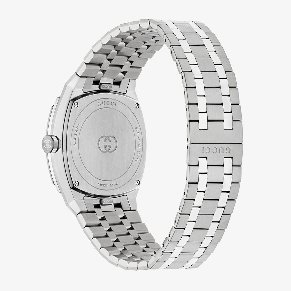 Discover the GUCCI 25H, a perfect blend of modern sophistication and timeless craftsmanship. This 36mm stainless steel watch features a striking black dial with the iconic Interlocking G detail, protected by durable sapphire crystal glass. Powered by precise quartz movement, it includes a practical date window and a sleek steel interchangeable bracelet. With the signature Gucci logo, this elegant timepiece is a statement of refined luxury and contemporary style.