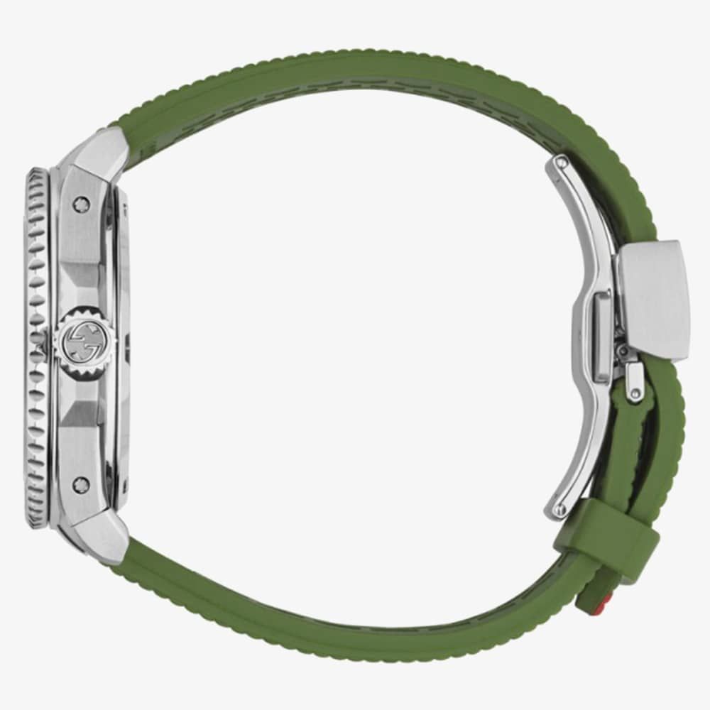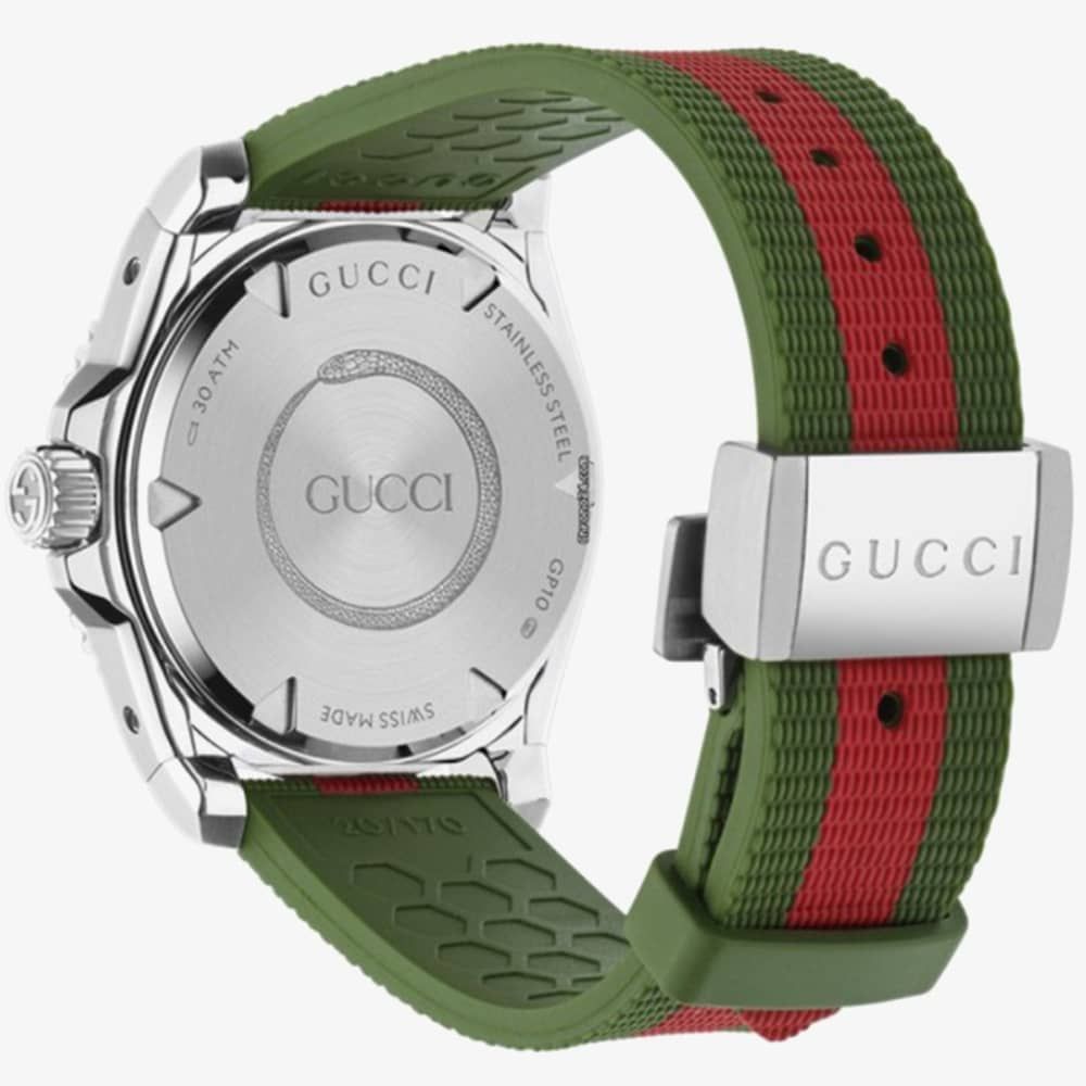 The Gucci Dive watch is a new addition to the brand's iconic dive watch collection. This stylish timepiece combines two of Gucci's most recognizable symbols: the Web stripe and the Gucci bee. The watch features a steel case and a ceramic bezel, and the black dial is adorned with the iconic bee motif. The strap is made of red and green rubber Web, which adds a touch of playful luxury to the overall look.