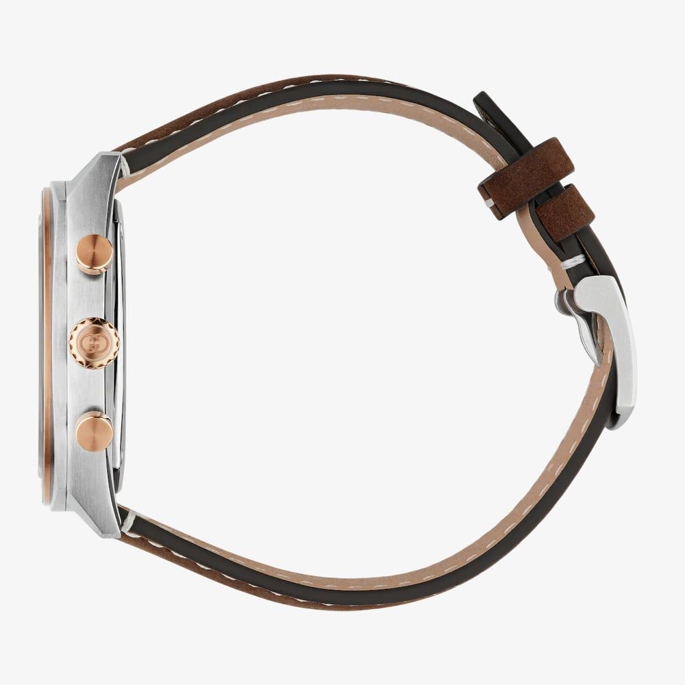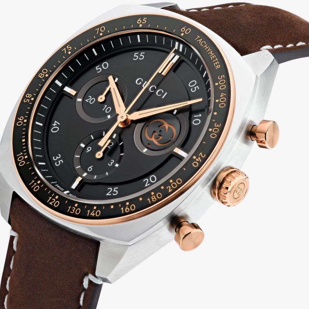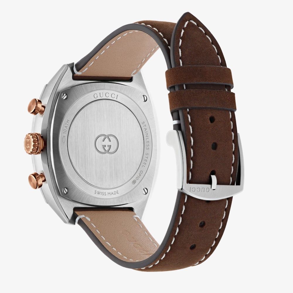 A sophisticated timepiece that blends classic design with modern luxury. This watch features a sleek dial adorned with the iconic interlocking G motif, symbolising Gucci’s heritage and unmistakable style. The rich brown leather strap adds a timeless touch, offering both comfort and versatility, making it perfect for everyday wear as well as more formal occasions. Its minimalist dial ensures readability while maintaining an understated elegance that complements any outfit.