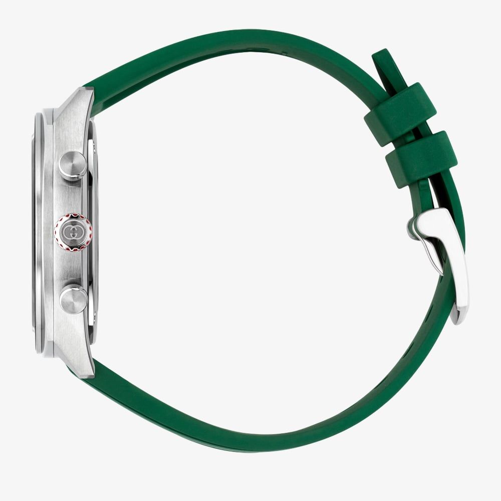 The watch features a striking green rubber strap that not only provides comfort but also adds a bold, distinctive touch to any outfit. Its stainless steel case houses a matching vibrant green dial adorned with Gucci's iconic logo, symbolising the brand's rich heritage and timeless appeal. Water-resistant up to 100 metres, it offers versatility for both formal occasions and everyday wear.