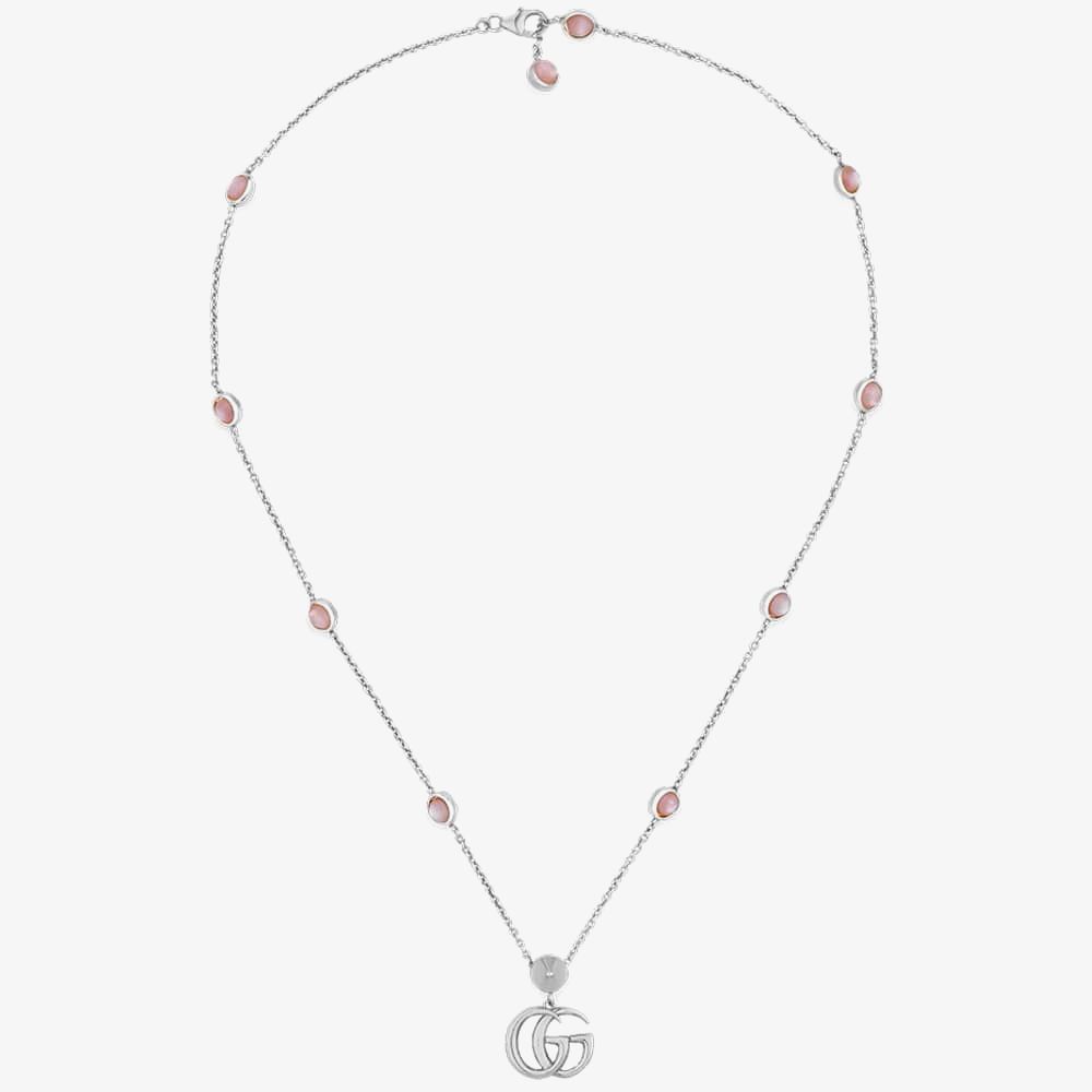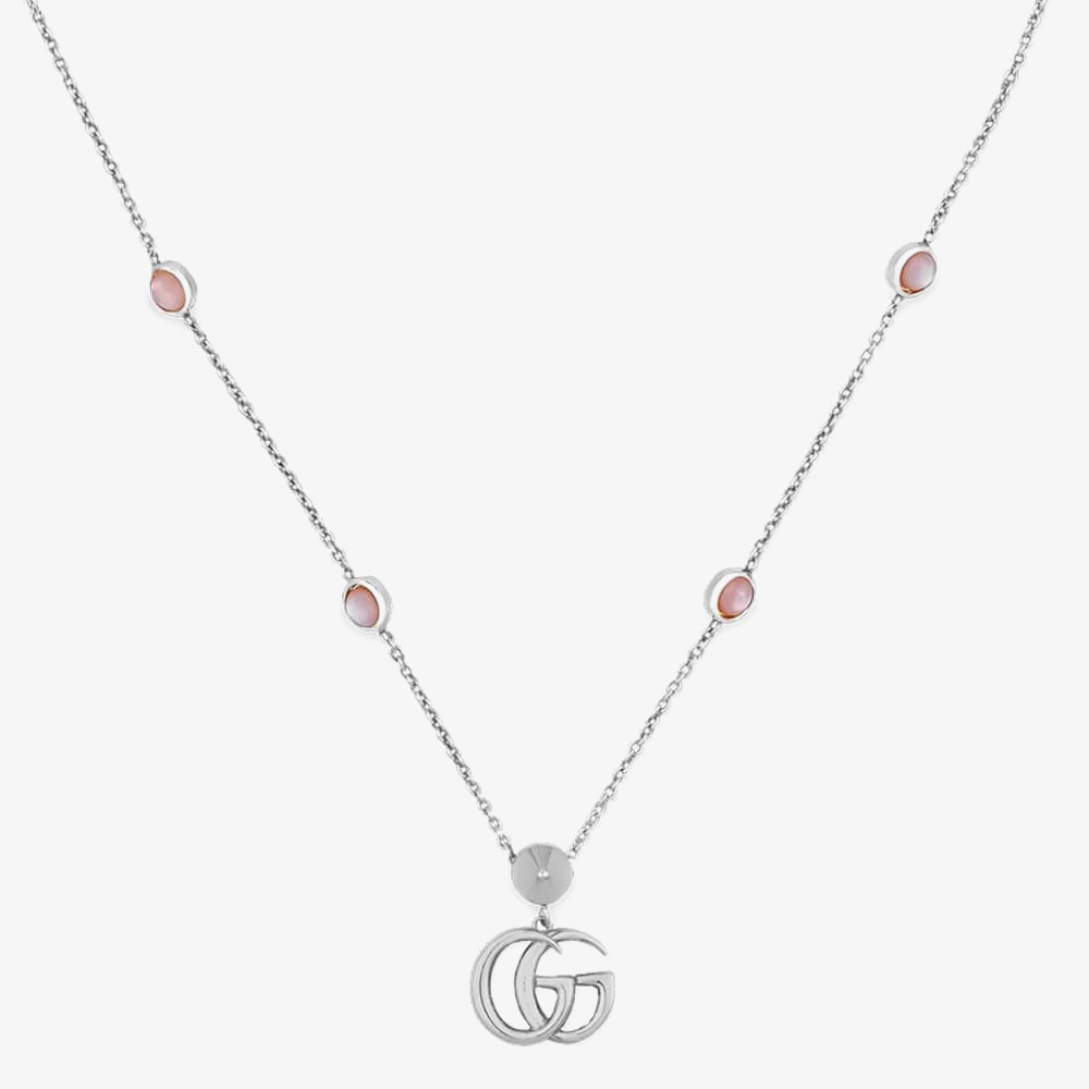 This delicate and sophisticated necklace in sterling sliver features a signature GG logo with pink mother of pearl stones. The elegant pink mother of pearl stones compliment the stunning sterling silver to create a gorgeous necklace perfect for every day wear.