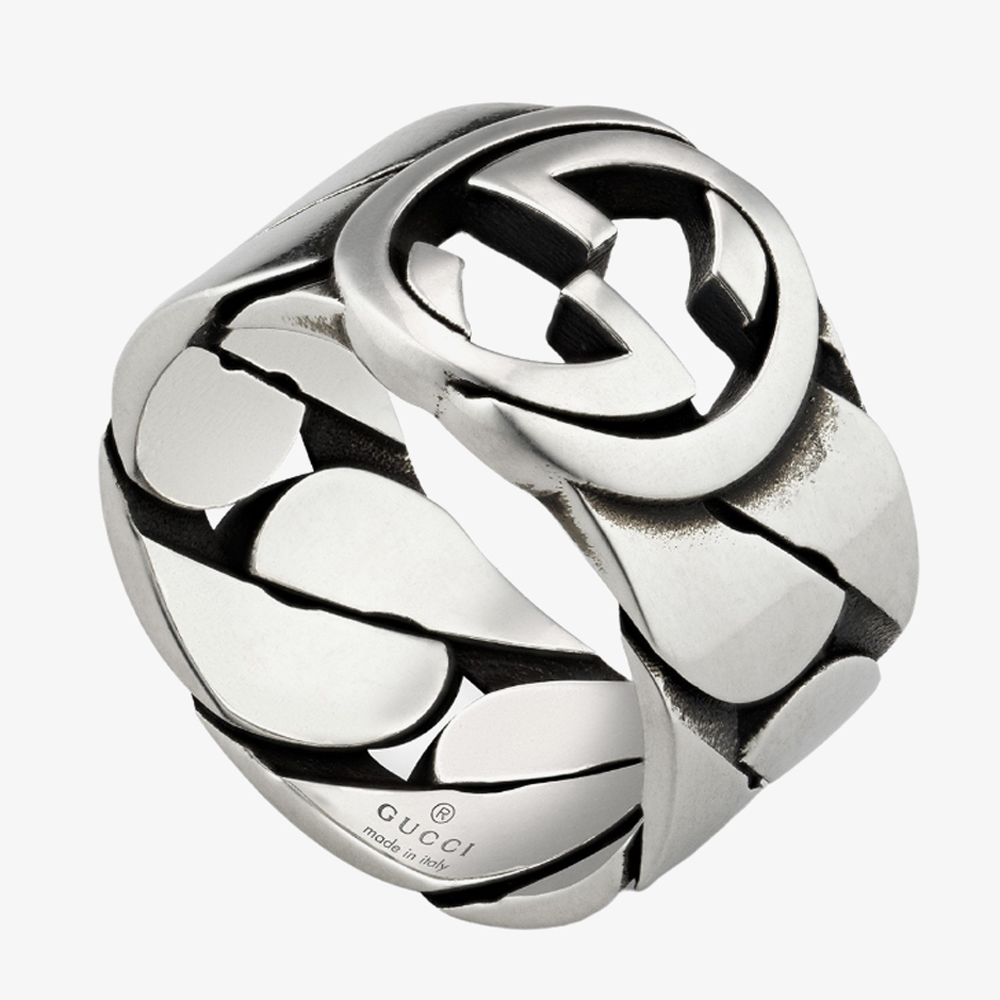 Gucci bring us this stylish ring from the Interlocking Collection. Created in Sterling Silver with a band width of 10 mm, this ring is completed with the House's monogram.