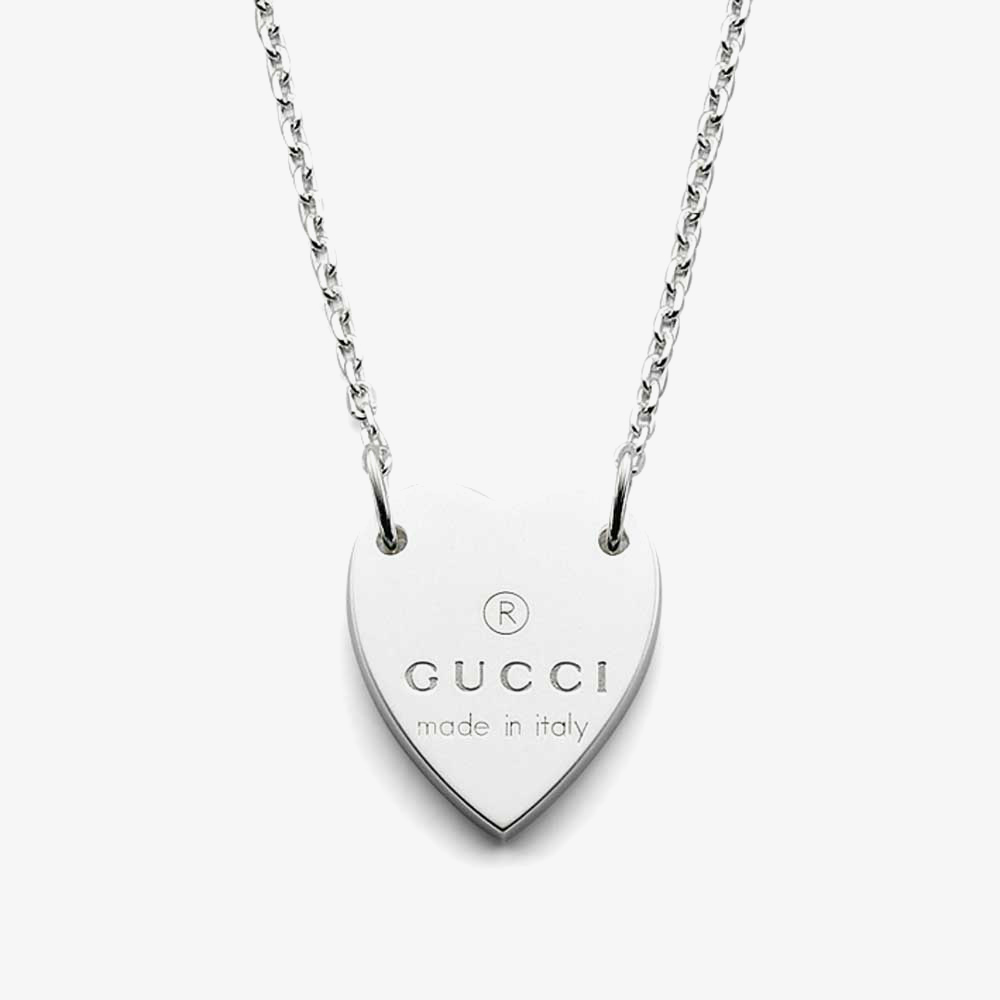 Sterling silver elegance for you to adorn your outfits with. The sleek belcher necklace holds a simple and stylish heart engraved with the Gucci logo securely fastening with a lobster style clasp. The ideal gift for your special someone this season, buy with confidence.
