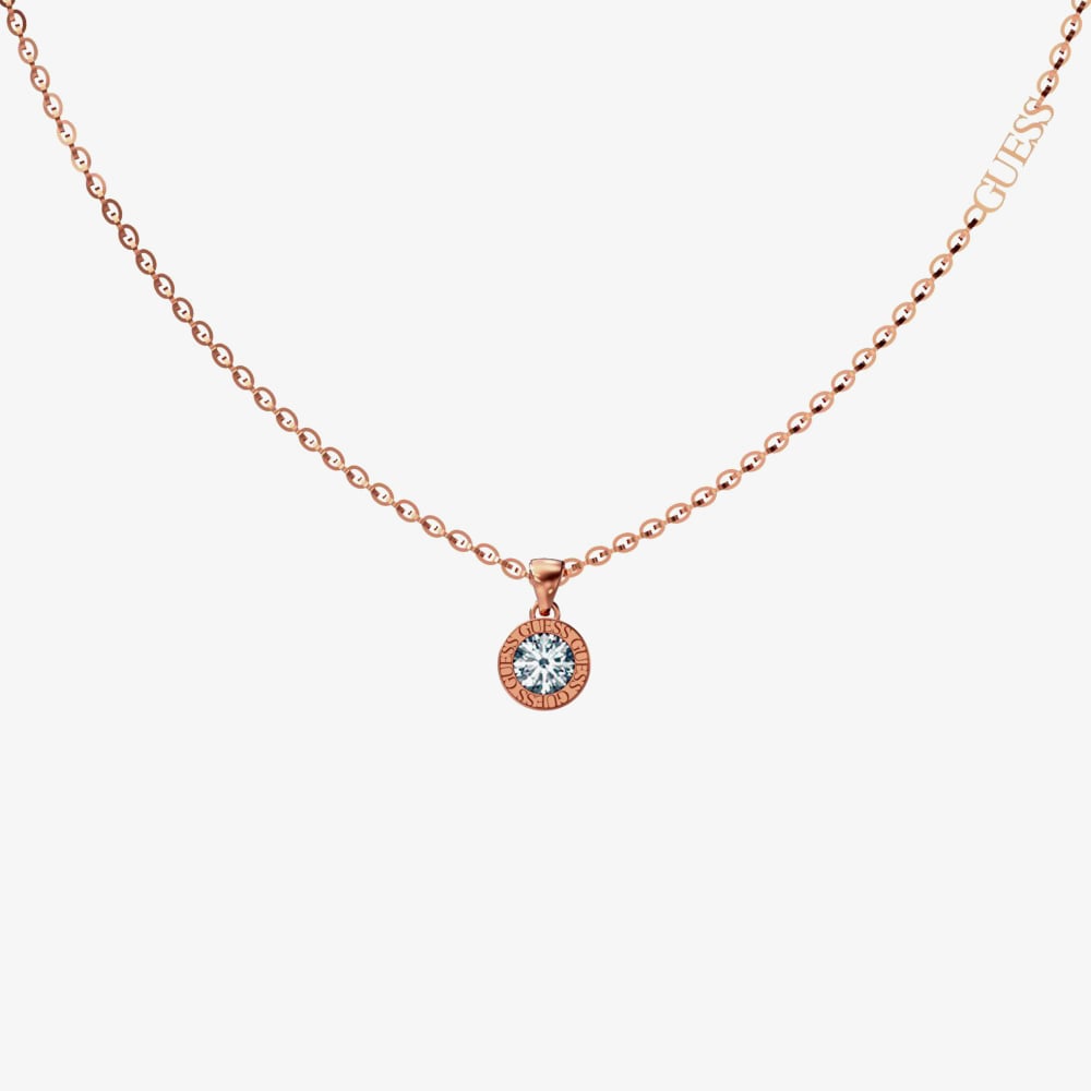 The Guess Colour My Day UBN02248RG necklace is created in rose gold plated stainless-steel. This rose gold-tone necklace features an eye-catching round logo design with a rub over set crystal which catches the light beautifully. This necklace is perfect for layering & combining with other Guess necklaces to create your own unique look. Length Adjustable 16 to 18 inches.