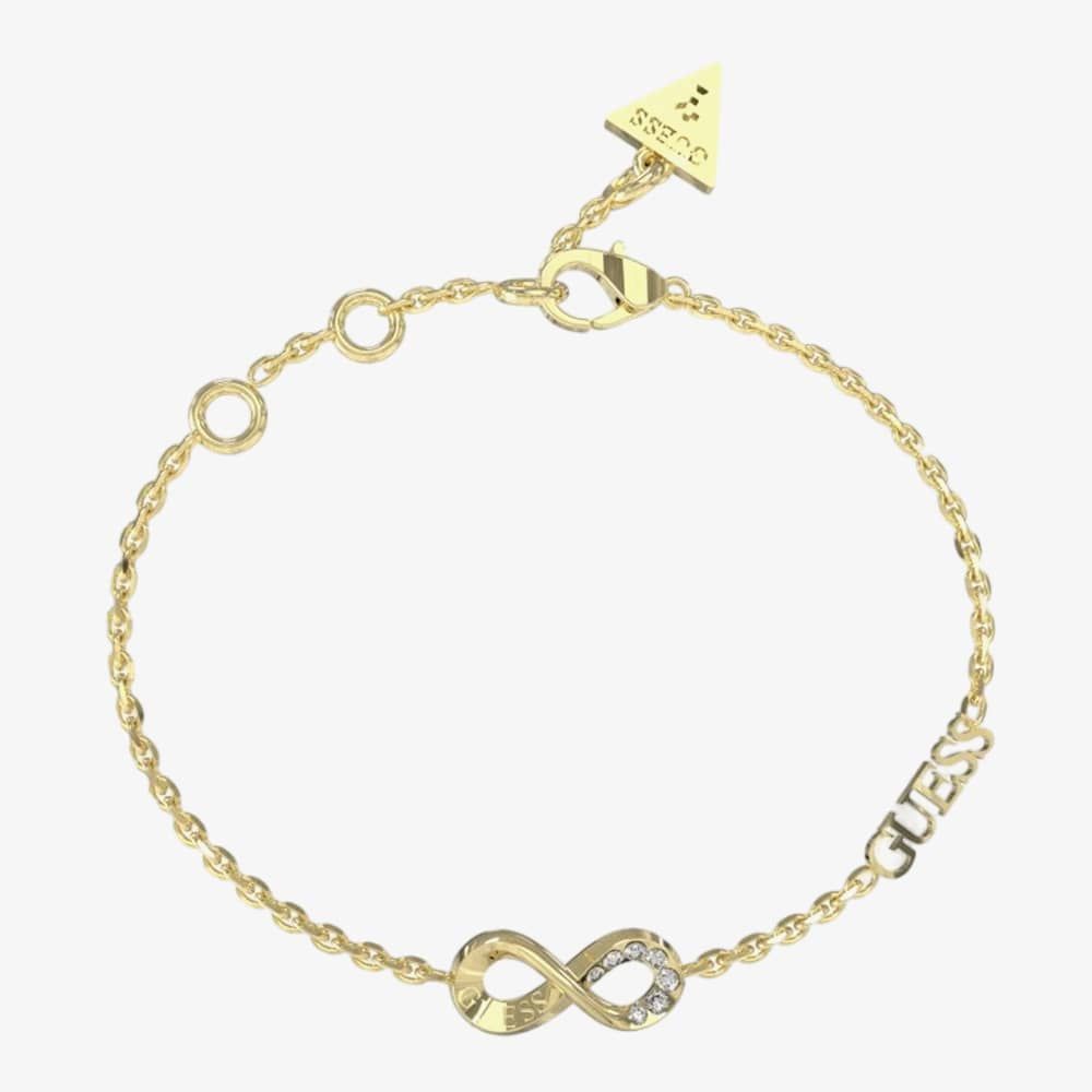 An adjustable Guess chain bracelet suiting wrist sizes from 17-21cm made from stainless steel and plated with gold. The infinity logo centrepiece is set with white crystals and there is also an additional section with GUESS lettering.