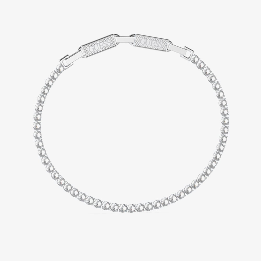 The GUESS Eternity Men's Sterling Silver-Tone Tennis Bracelet features a classic design with a row of sparkling stones set in a sleek sterling silver-tone band, offering a refined and timeless accessory for any occasion.