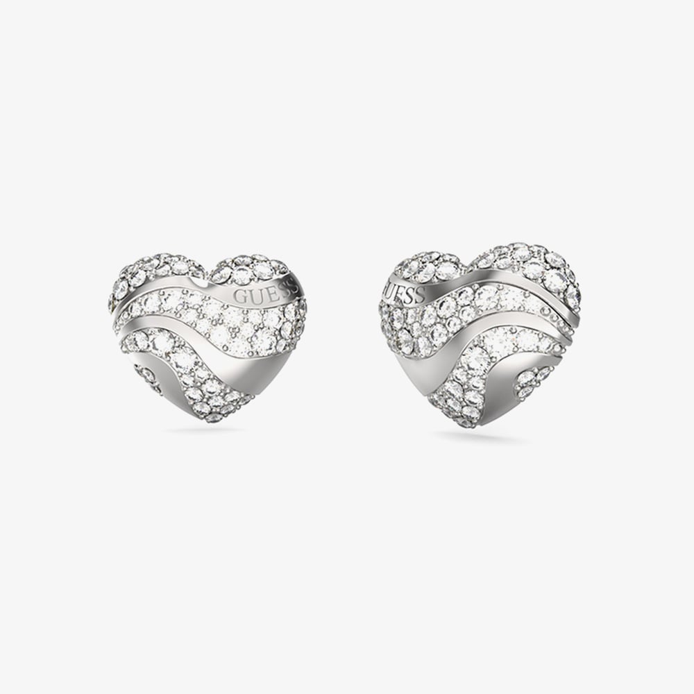 The GUESS In My Heart dropper studs are crafted from silver-tone stainless steel, featuring delicate heart-shaped designs embellished with shimmering crystals and a flowing wave pattern for a sophisticated and romantic look.