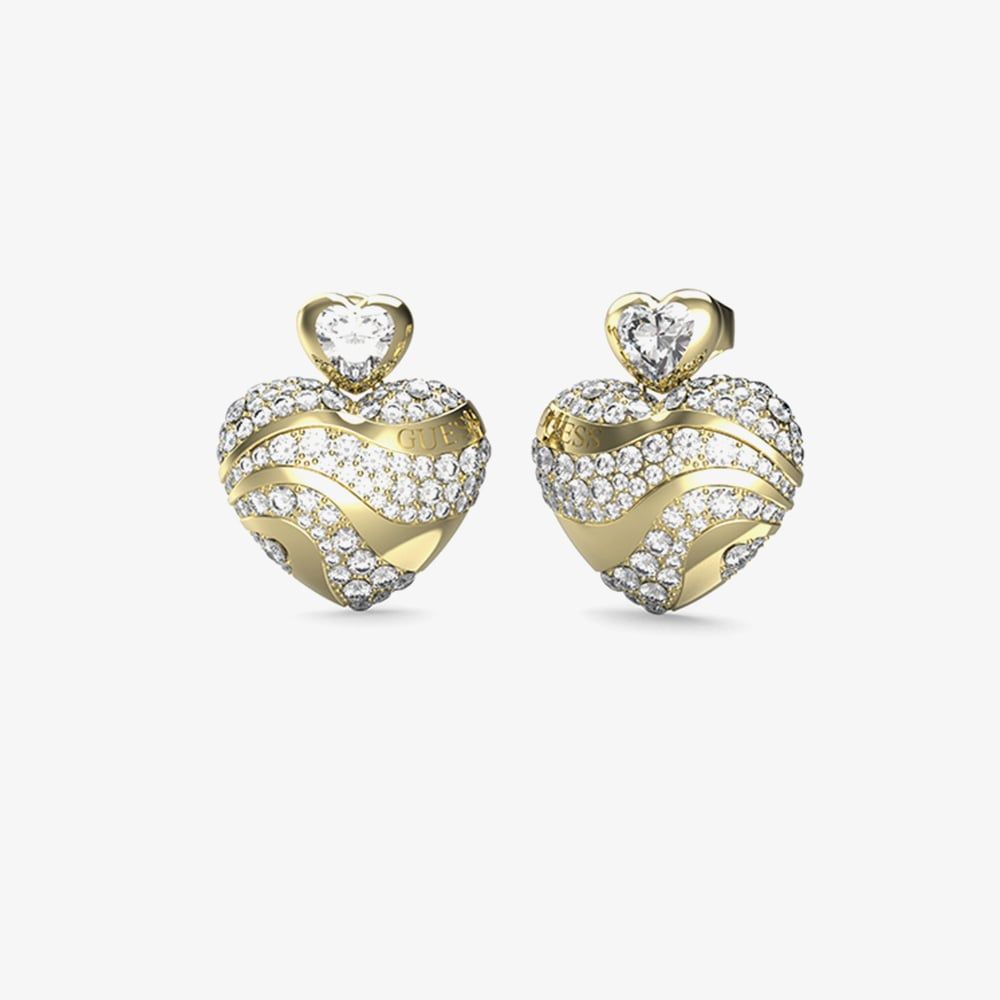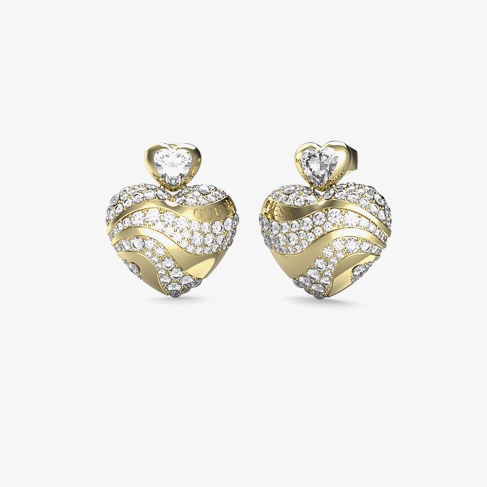 The GUESS In My Heart dropper earrings are crafted from gold-tone stainless steel, featuring elegant heart-shaped droppers adorned with sparkling crystals and a graceful wave design for a timeless, romantic touch.