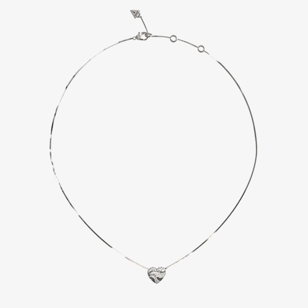 The Guess In My Heart Necklace features a silver-tone snake chain with a heart charm adorned with sparkling crystals and elegant wave details, creating a sophisticated and romantic look.