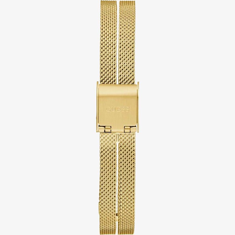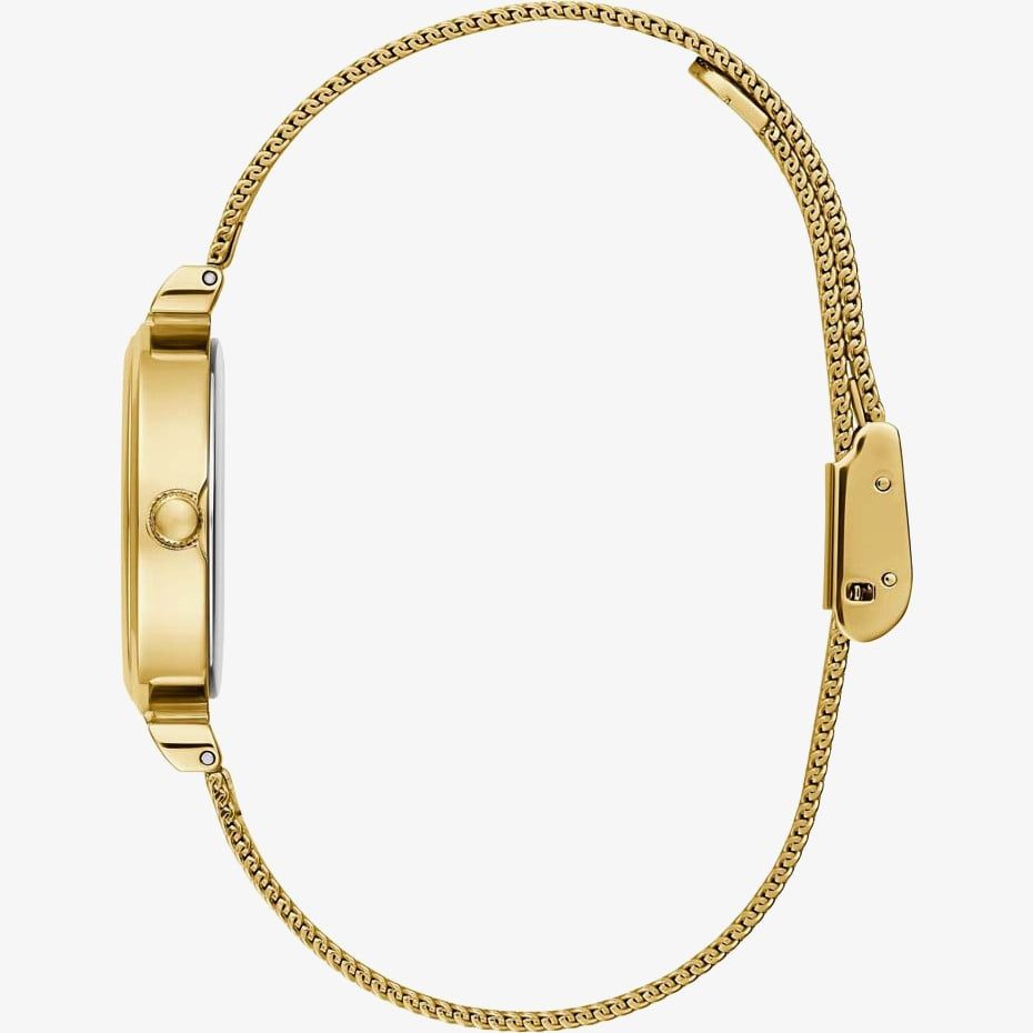 The Guess Array ladies watch is a luxurious gold-plated stainless steel timepiece with a refined mother-of-pearl dial. Adorned with sparkling crystals along the mesh bracelet, this watch combines elegance and glamour, making it a standout accessory for any occasion.