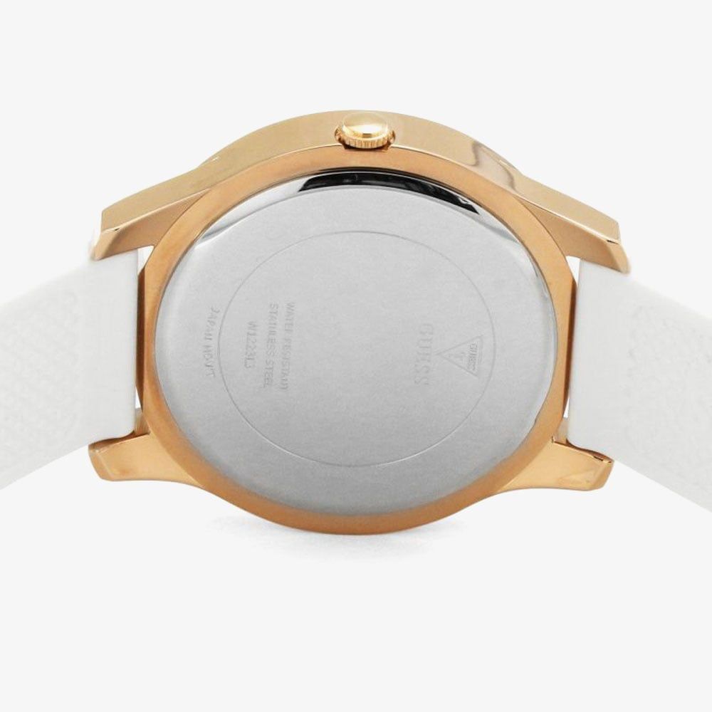 The crush timepiece from Guess features a rose gold plated stainless steel case. The case houses a glistening pink, yellow and orange bubble effect dial. The piece is finished with a contrasting soft white leather strap.