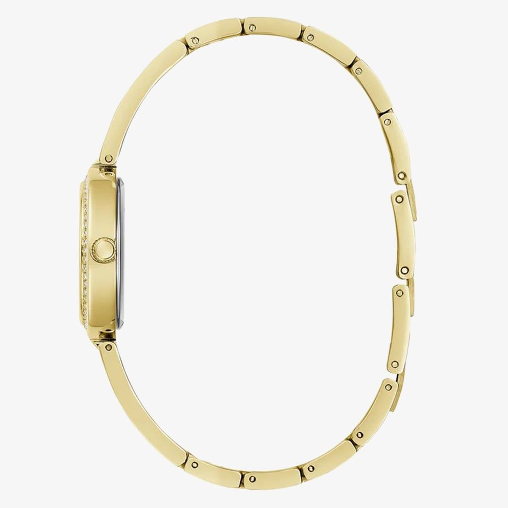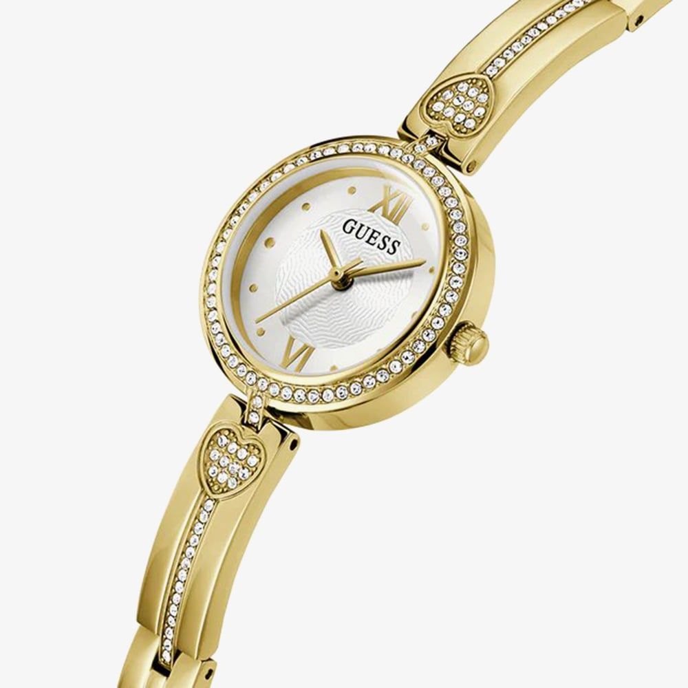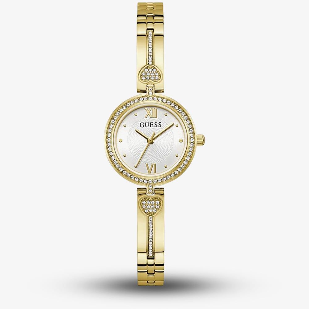 The Guess Lovely Ladies Watch features a sleek gold tone stainless steel design with white crystals surrounding the bezel, adding a touch of sparkle to your everyday look. Subtle heart details on either side of the crystal-embellished bangle enhance its charm, making it the perfect accessory for effortless elegance and daily wear.