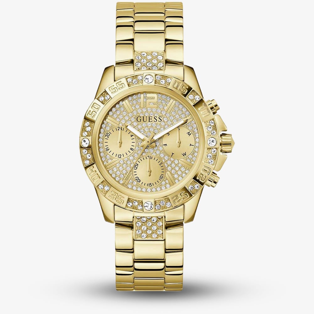 The Guess Ladies Majesty Watch is a luxurious stainless steel gold-plated timepiece, adorned with crystals across the dial, bezel, and bracelet. This dazzling design exudes elegance and sophistication, making it a perfect statement piece for those who love a bold, glamorous look.
