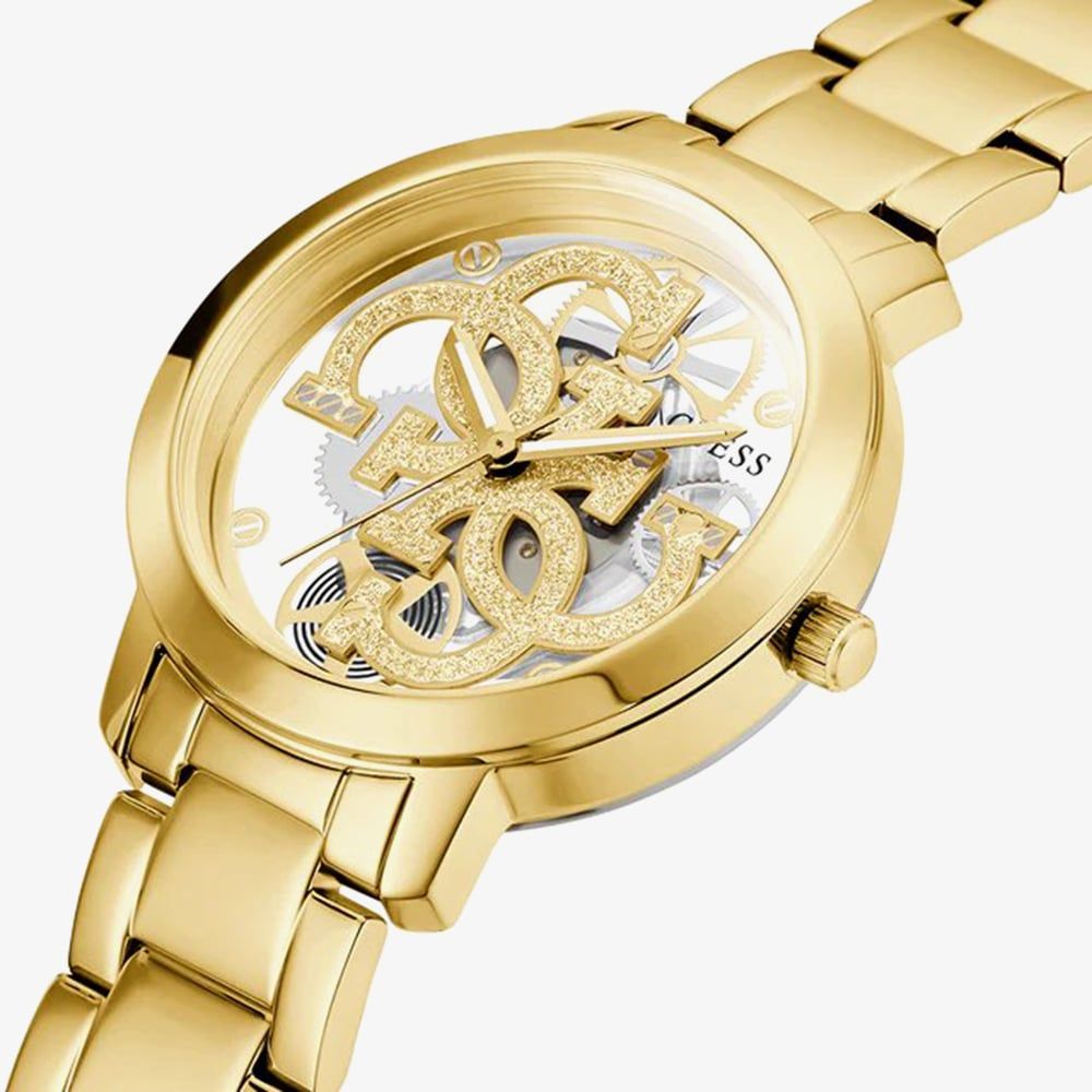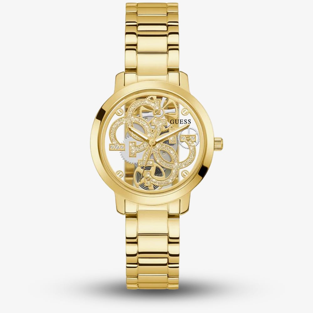 The Guess Ladies Quattro Clear Watch showcases a luxurious blend of stainless steel with elegant gold plating. Its eye-catching skeleton dial features glittering gold G logos, adding a bold, glamorous touch. This standout design combines sophistication with Guess's iconic style, making it a perfect statement piece for any fashion-forward look.
