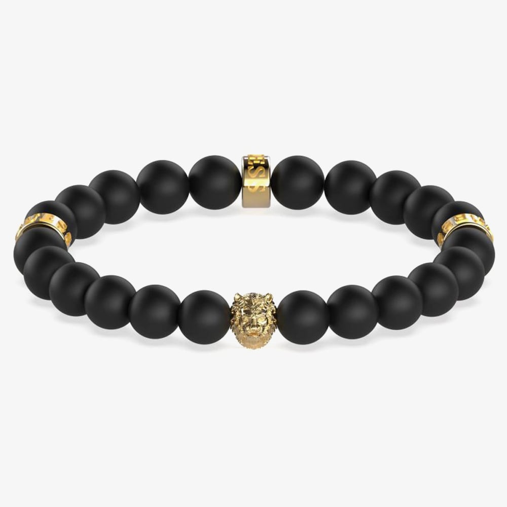 The Guess Lion King Beaded Bracelet UMB01303YG is created with black beads & stainless-steel. This expandable beaded bracelet features gold-tone detailing along with a 12mm gold-tone Lion head motif.