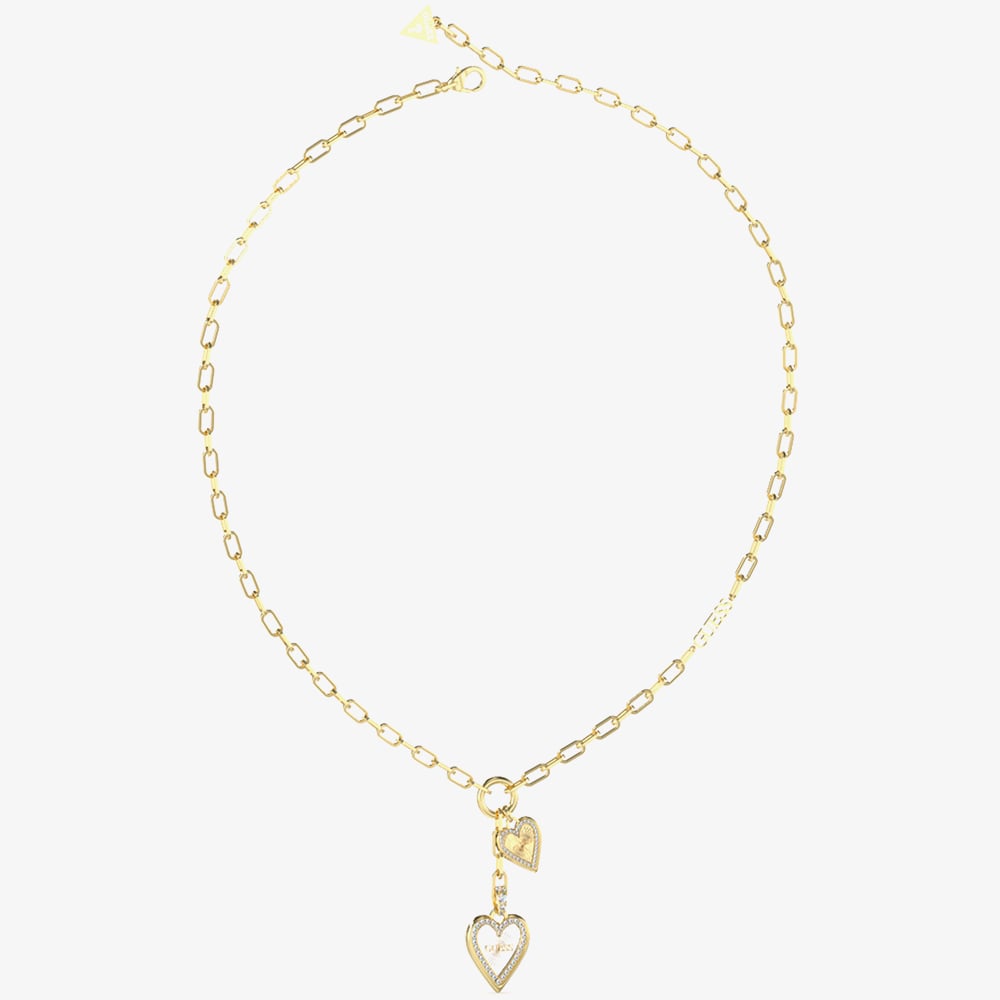 The Guess Love Me Tender Necklace is crafted from gold-tone stainless steel and features two heart dropper pendants adorned with sparkling crystals. This elegant chain necklace exudes romance and sophistication, making it the perfect accessory for any occasion.