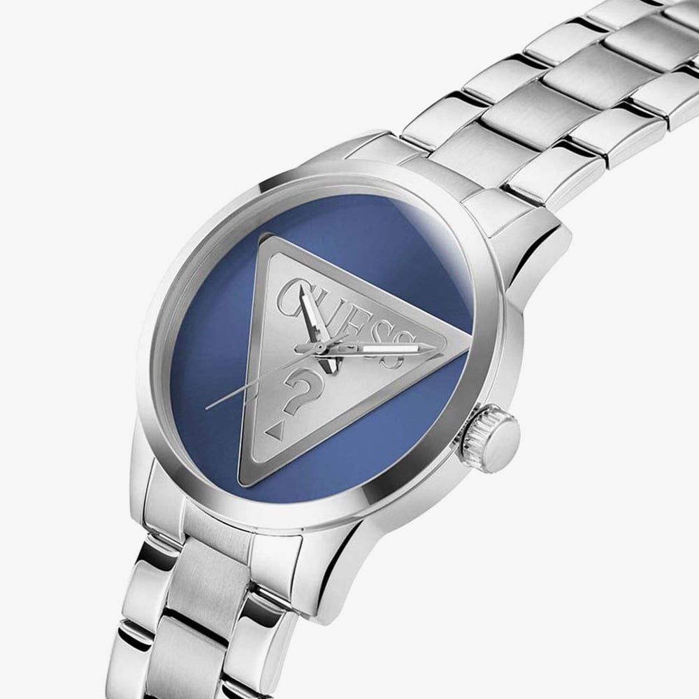 This Guess men’s watch features a silver tone stainless steel case and bracelet with a blue dial. The iconic Guess logo is centred on the dial, framed by simple hour markers and sleek hands. Durable and stylish, it’s a timeless accessory for any occasion.