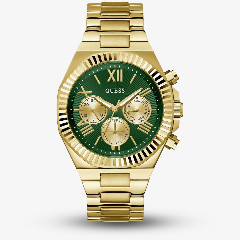 The Guess men’s Equity watch features a gold tone stainless steel case with a striking green dial. It includes three sub dials for added functionality, offering both style and practicality. The bold combination of gold and green makes this watch a standout accessory for any occasion.