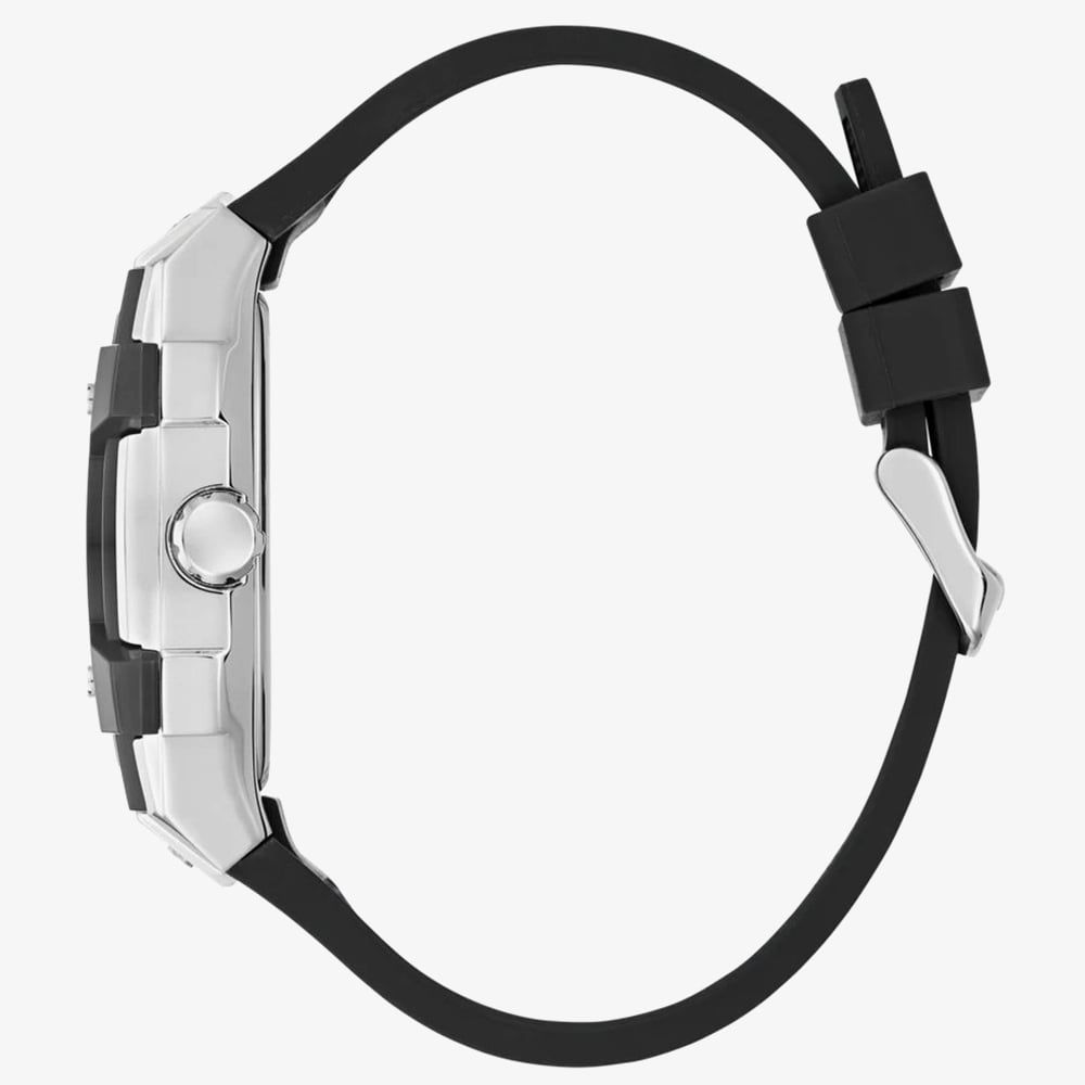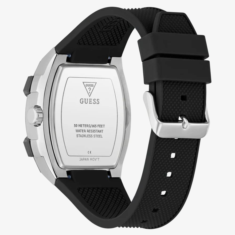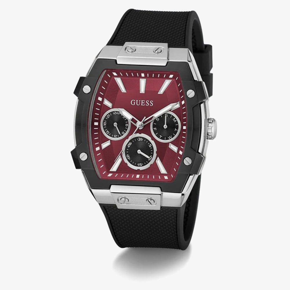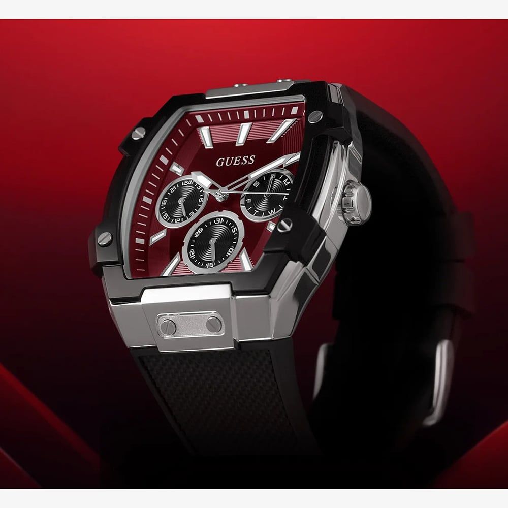 Innovative and contemporary, this multi-function watch stands out with its architectural 44mm rectangular tonneau case. The GW0956G1 features a silver tone stainless steel case paired with a textured black silicone strap, offering a modern look that is built for durability. The dial is equipped with sub-dial displays including, day, date, and 24 hour time for added functionality, catering to those who lead an active and organised lifestyle. The bold red accents on the dial provide a sharp, energetic contrast.