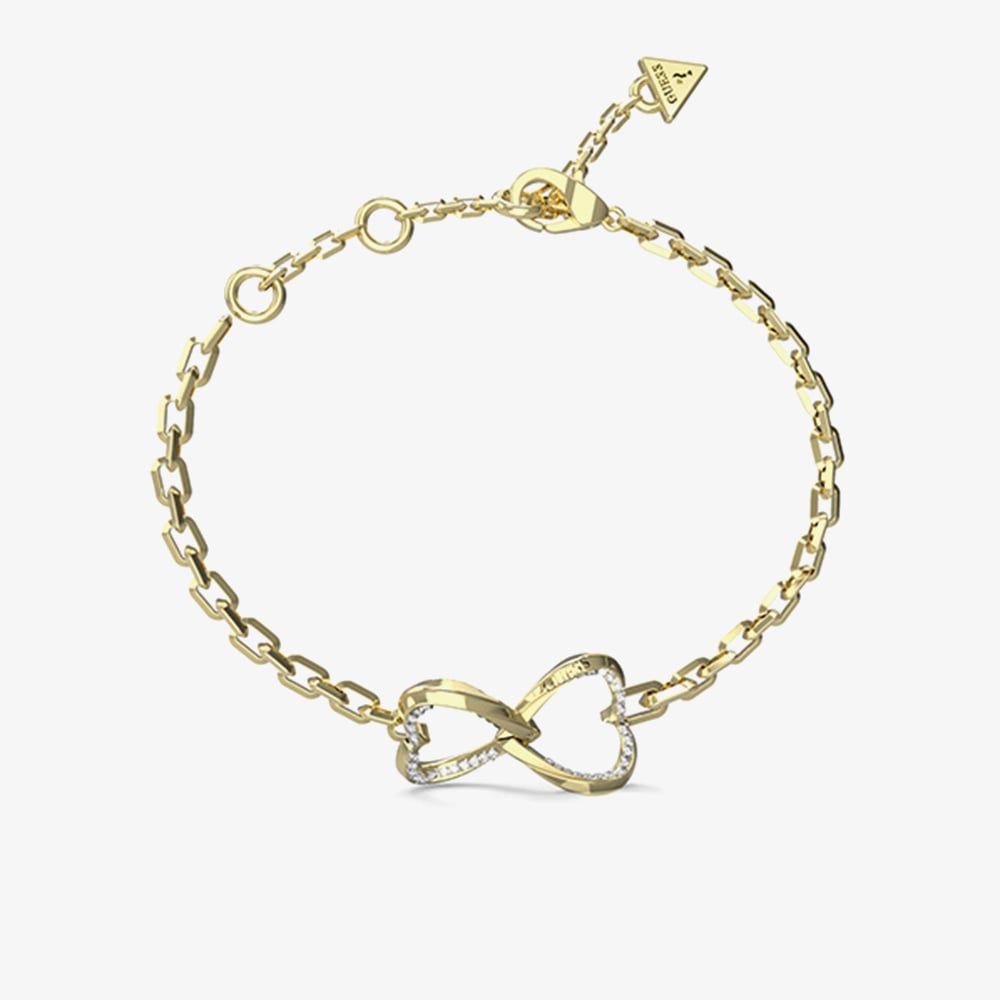 The Guess Mon Amour Bracelet in gold-tone stainless steel showcases two interlinked hearts adorned with sparkling crystals. Set on a delicate trace chain with a lobster clasp, it exudes timeless elegance and charm.