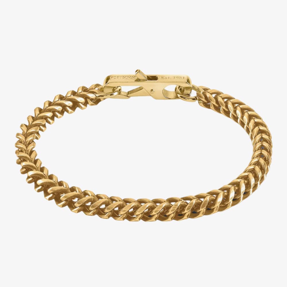 A Guess chain bracelet measuring 21 cm made from stainless steel and plated with gold. This foxtail chain also has a push button deployment clasp and measures 5mm thick.