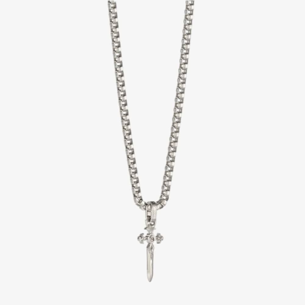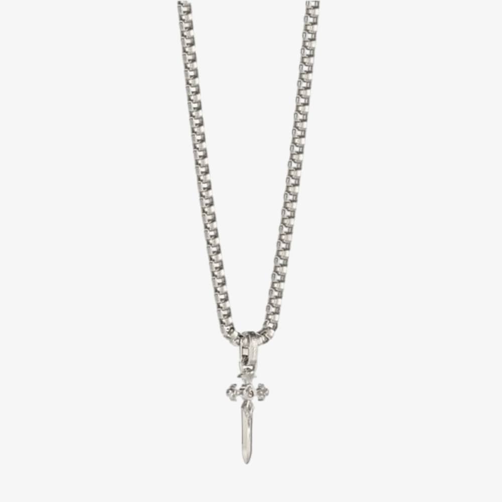 A Guess pendant made from stainless steel with rhodium plating. It also has a belcher chain measuring 26 inches long and weighs 17.1 grams.