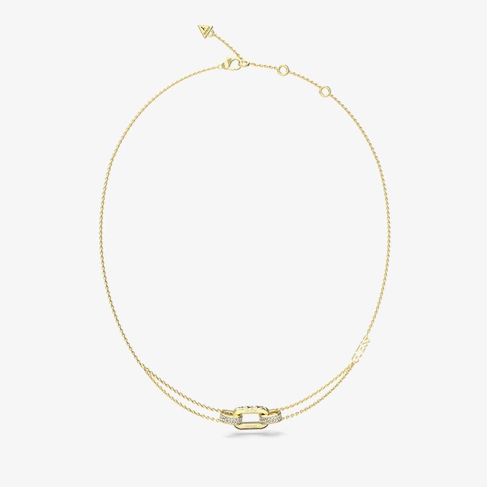 The Guess Stylish Necklace in gold-tone stainless steel features a trendy double chain design accented with crystal-adorned links, adding a modern and glamorous touch to any outfit.