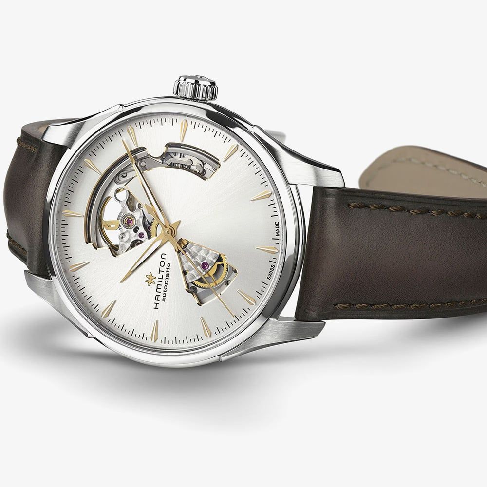 The 40mm Hamilton Jazzmaster Open Heart highlights precision with its striking white cut-out dial, offering a glimpse into the intricate inner mechanics of the timepiece. At its core is the H-10-S automatic movement, featuring an 80-hour power reserve and Nivachron™ balance spring, ensuring both reliability and performance. This watch is paired with a sophisticated dark brown leather strap, complementing the stainless steel case. The Jazzmaster Open Heart exemplifies Hamilton's evolving craftsmanship and meticulous attention to detail, making it a refined choice for those who appreciate both form and function.