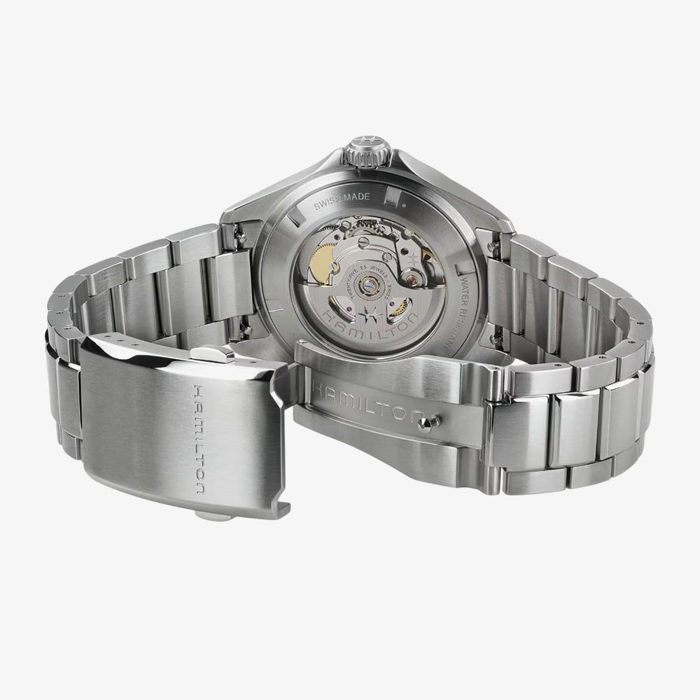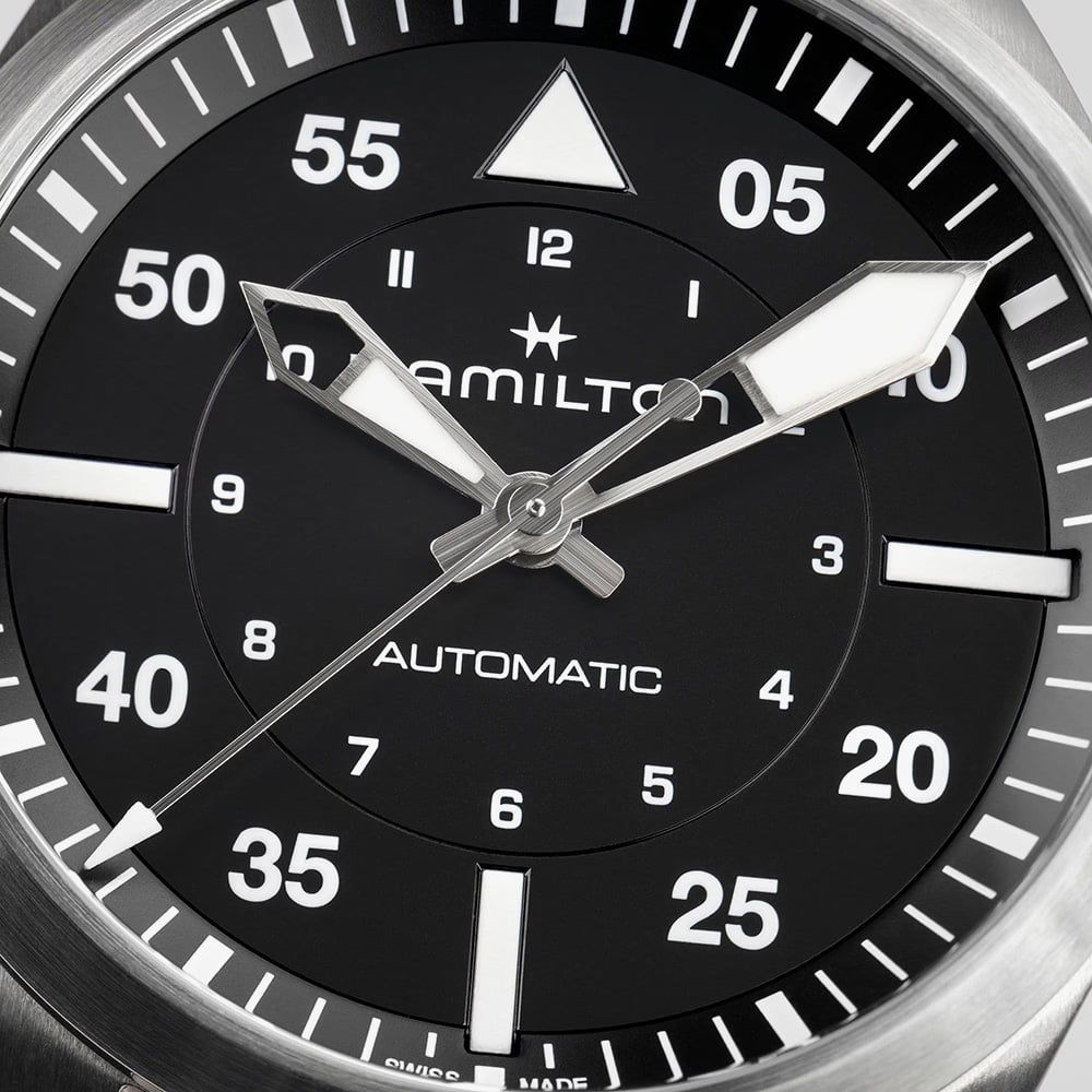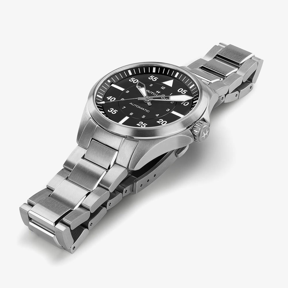 Engineered for the skies and designed for those with a passion for flight, the Khaki Aviation Pilot 39mm embodies the adventurous spirit of Hamilton’s storied Khaki collection. Powered by the robust H-10 automatic movement, it delivers an impressive 80-hour power reserve and features a Nivachron balance spring for enhanced resistance to magnetic fields and temperature variations. The all-black dial is complemented by luminous hands for optimal readability in low-light conditions, while a brushed and polished stainless-steel bracelet adds a sleek, professional finish.