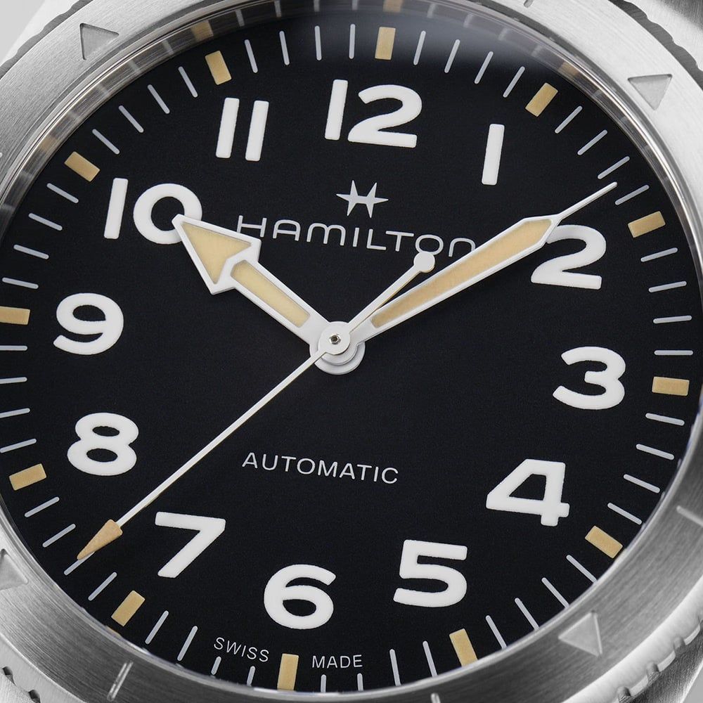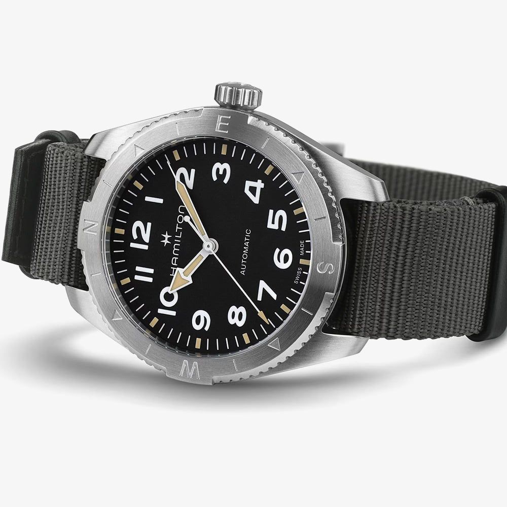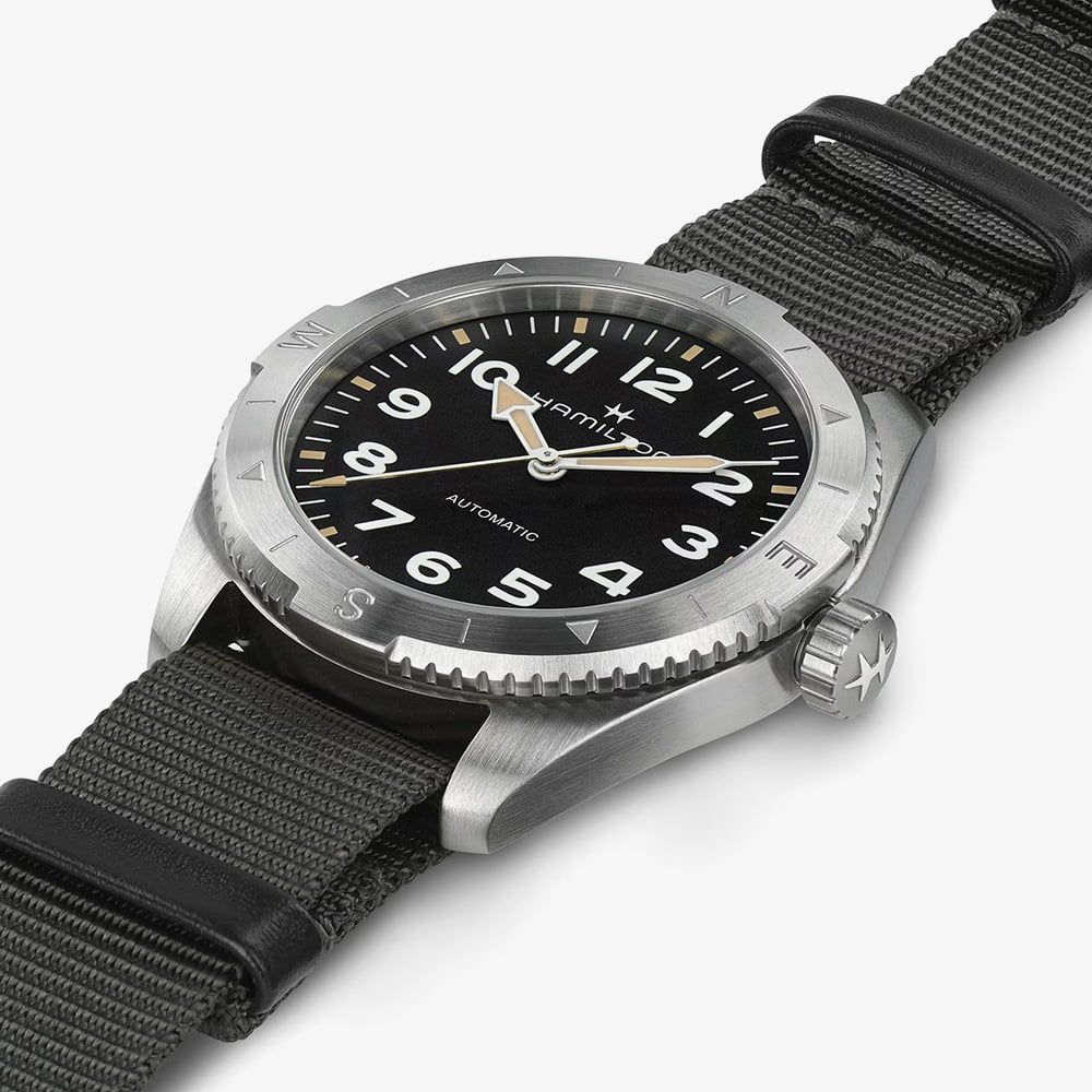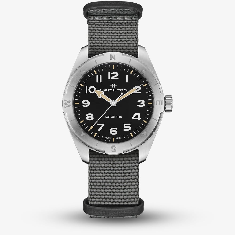 Preparing for outdoor adventures has never been simpler with the Khaki Field Expedition and its new NATO strap. Designed for all-terrain use, this adventure watch features a compass design to assist with navigation using the sun. Set in a 41mm stainless steel case and paired with a grey NATO textile strap, it includes a screw-down crown and a black sandblasted dial, ensuring it stands up to the toughest conditions.